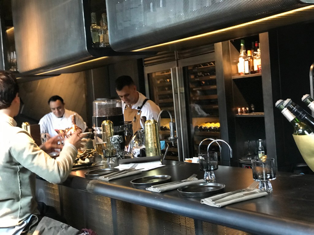 The limited interior space of the restaurant was well utilized with nothing spared. The lighting, probably one of the most signature elements I think of when I consider Tom Dixon, was a big highlight of the space. The balance he strikes between industrial, organic and material – all very unfettered- is admirable. He uses a contrast of materials and forms that balance between earthly/ heavy/ square and organic/ light/ transparent.