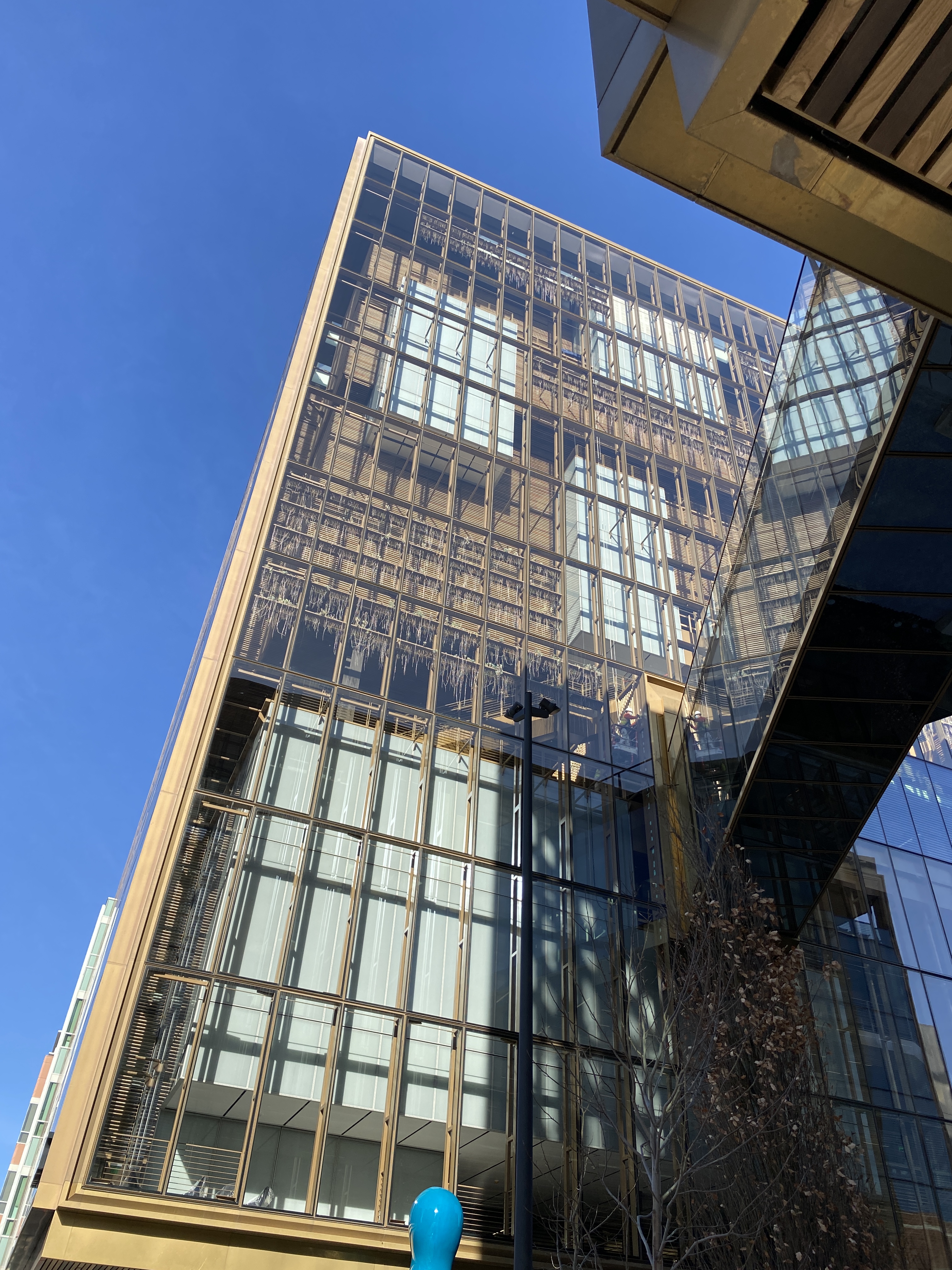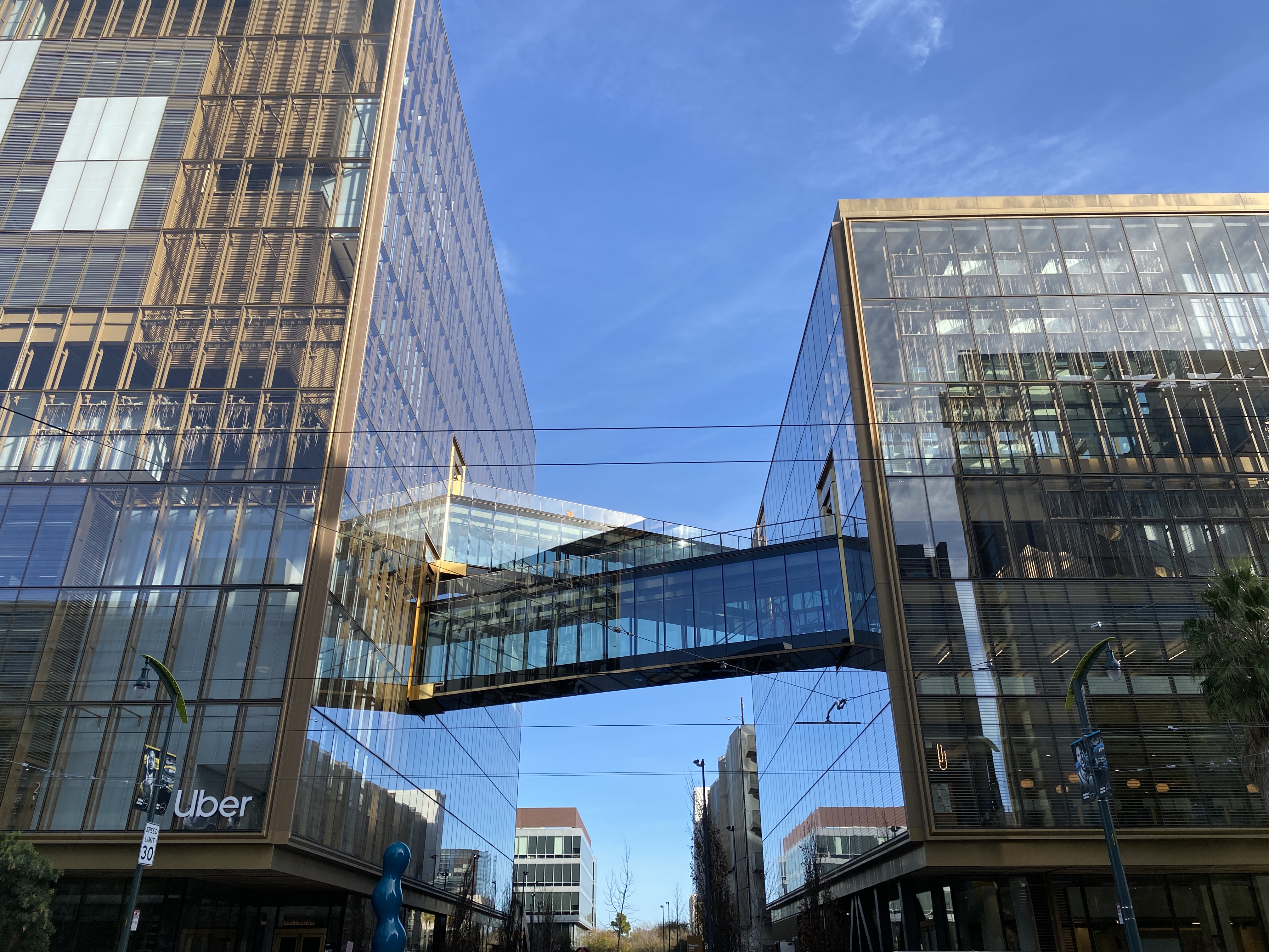 Having lived in many cold weather climates, anything that allows people to transit between buildings without having to go outside seems exceptionally smart. Its really not that cold in San Francisco, so I suppose efficiency is the practicality here? I wonder if people have to walk single file- the walkways don’t seem that wide. I wish they would have built a joining top floor similar to the CCTV building in China or La Défense cause that would have made this campus epic.