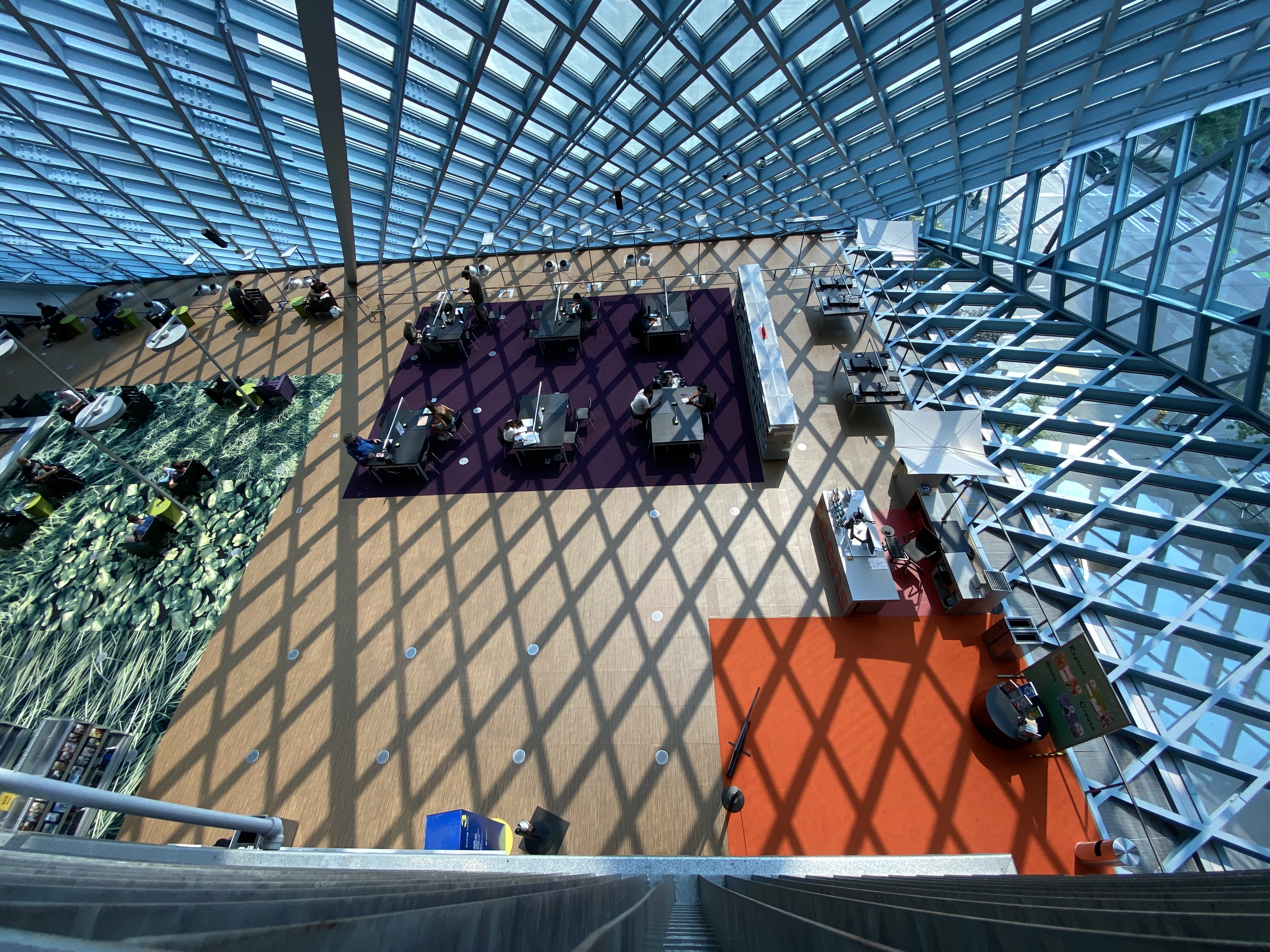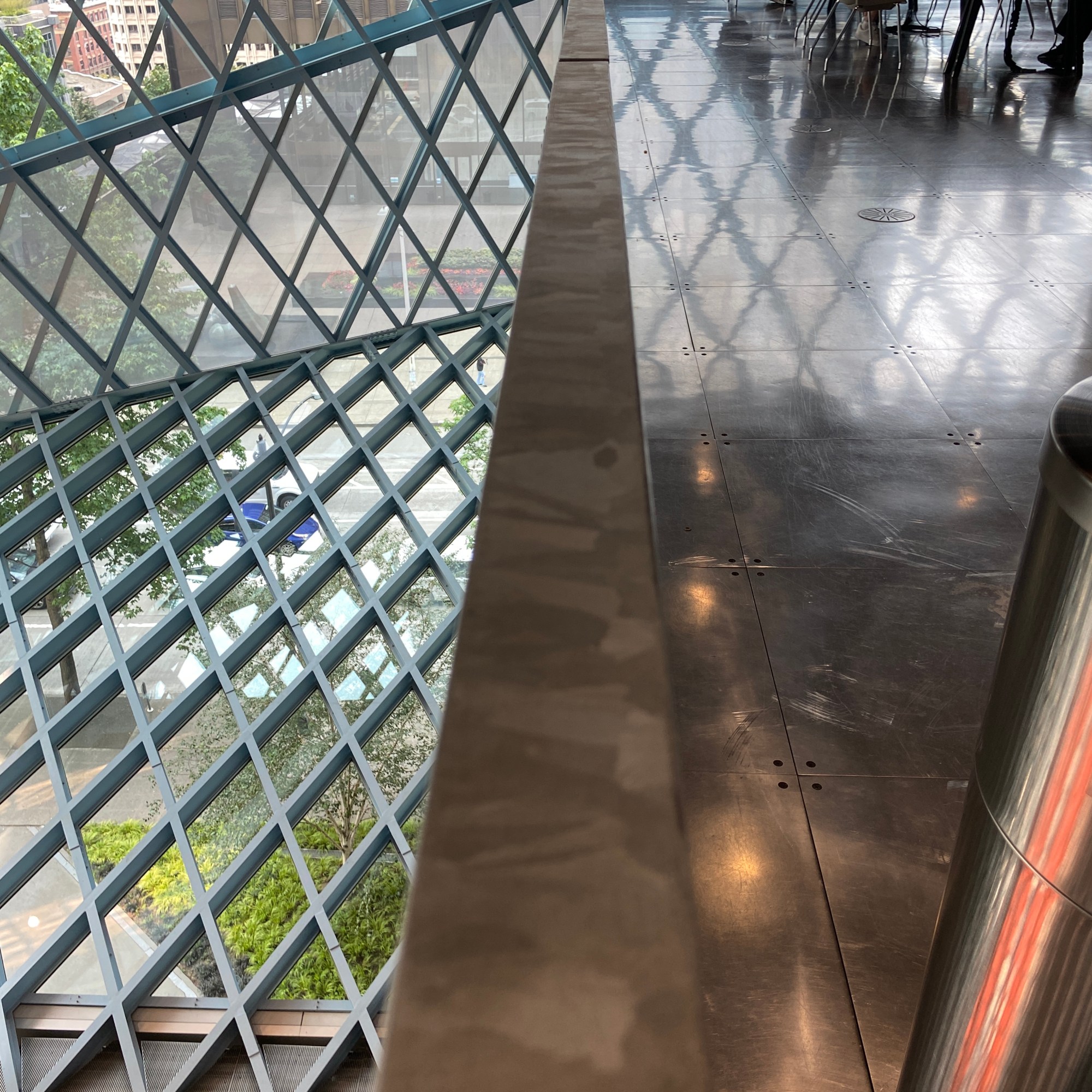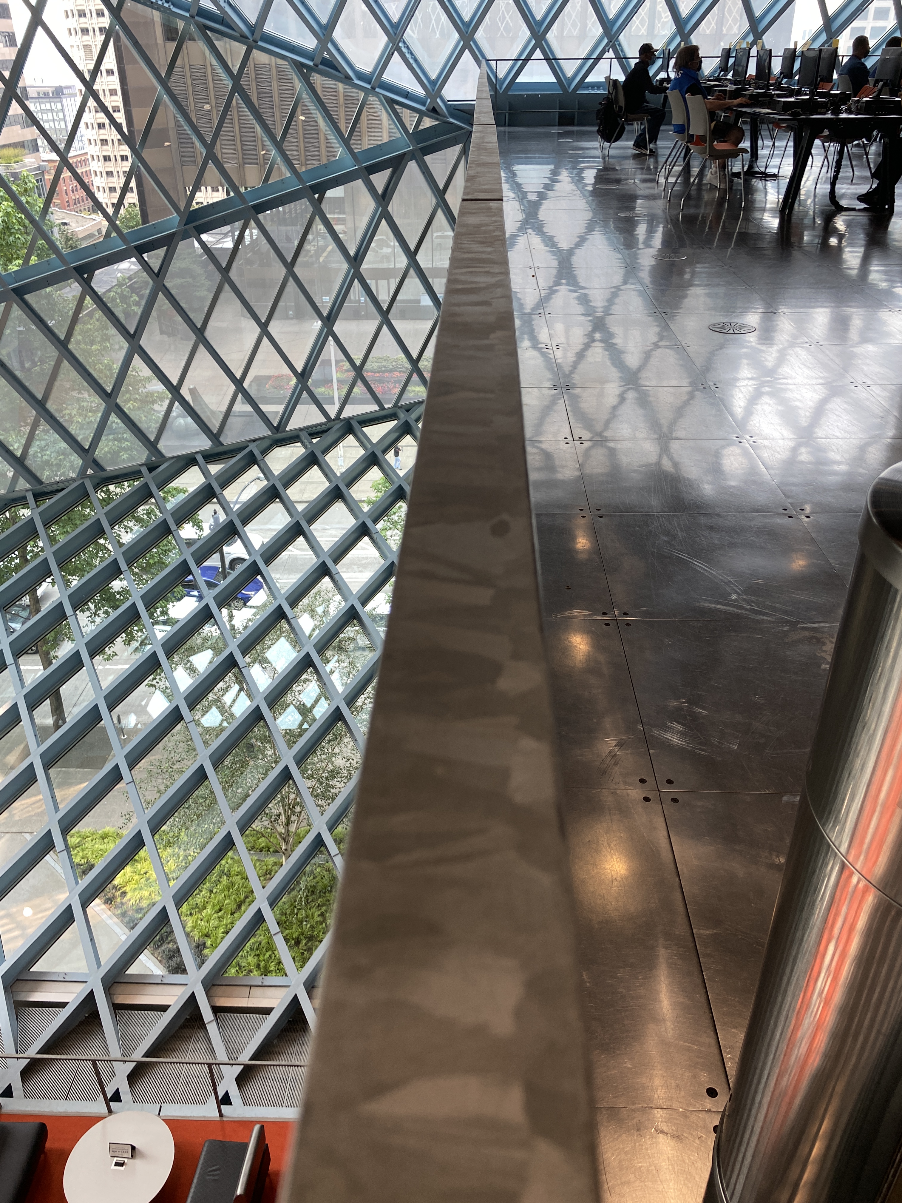 Of note is the top most floor and the material choice for the floor. A current colleague of mine in fact asked me if I was able to visit the top floor for this particular reason. Surprisingly noisy, but perhaps a deterrent to making noise? Unusually industrial and cool compared to the warmth of the wood materials of the main floor.