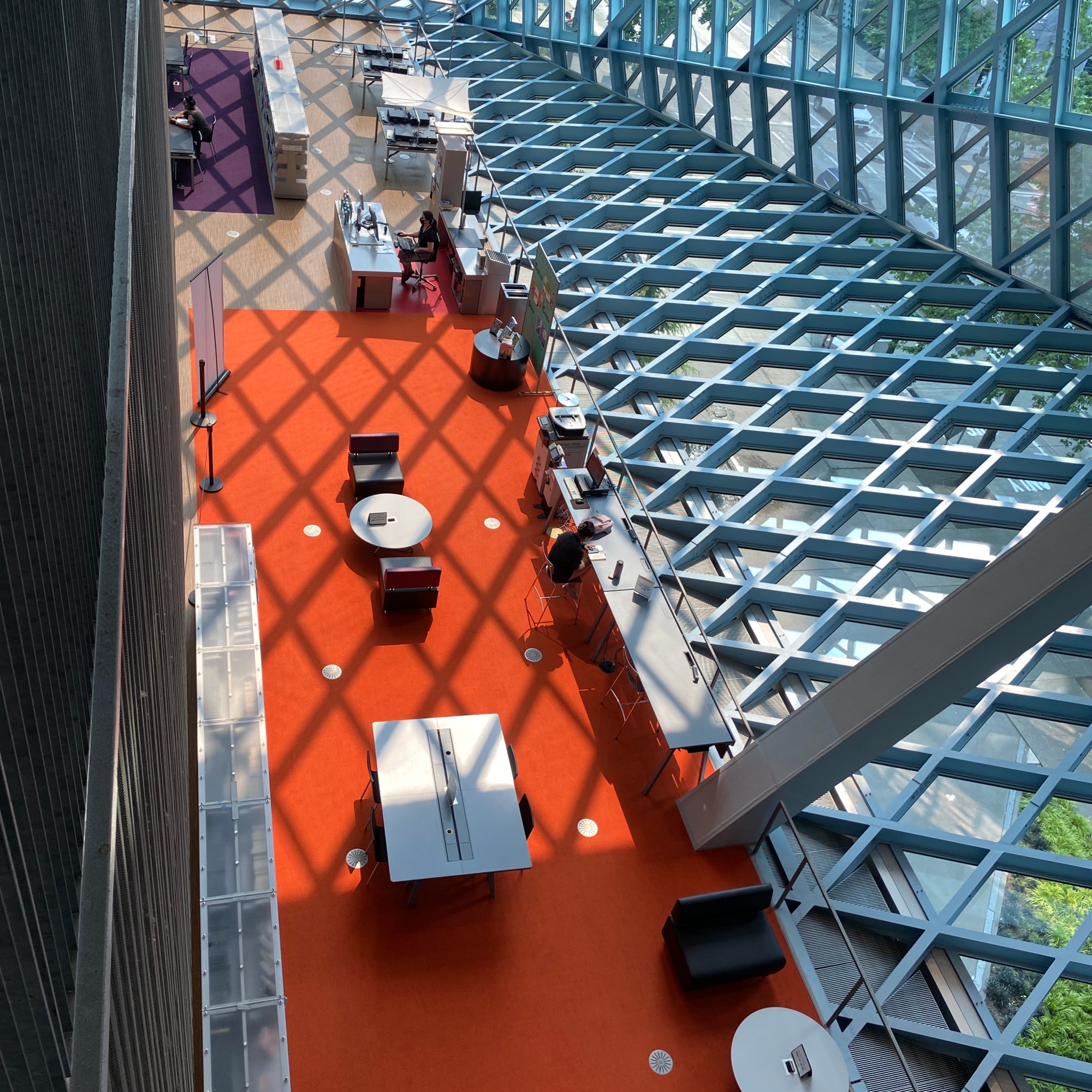 I’ll never forget the moment entering the building from the lowest level, taking the elevator to one of the few open floors due to COVID restrictions (must go back to visit the others) and then arriving at the main hall. The light through the trellis window frames, with the minimal amount of furniture- married with the class Koolhaus use of bold colors. I could have stayed there for hours, a chance to have the time and space (two critical themes to rear their heads unbeknownst to me in later 2021) to think and be. I very much plan to go back and grab a book to look occupied while just being immersed in the space.