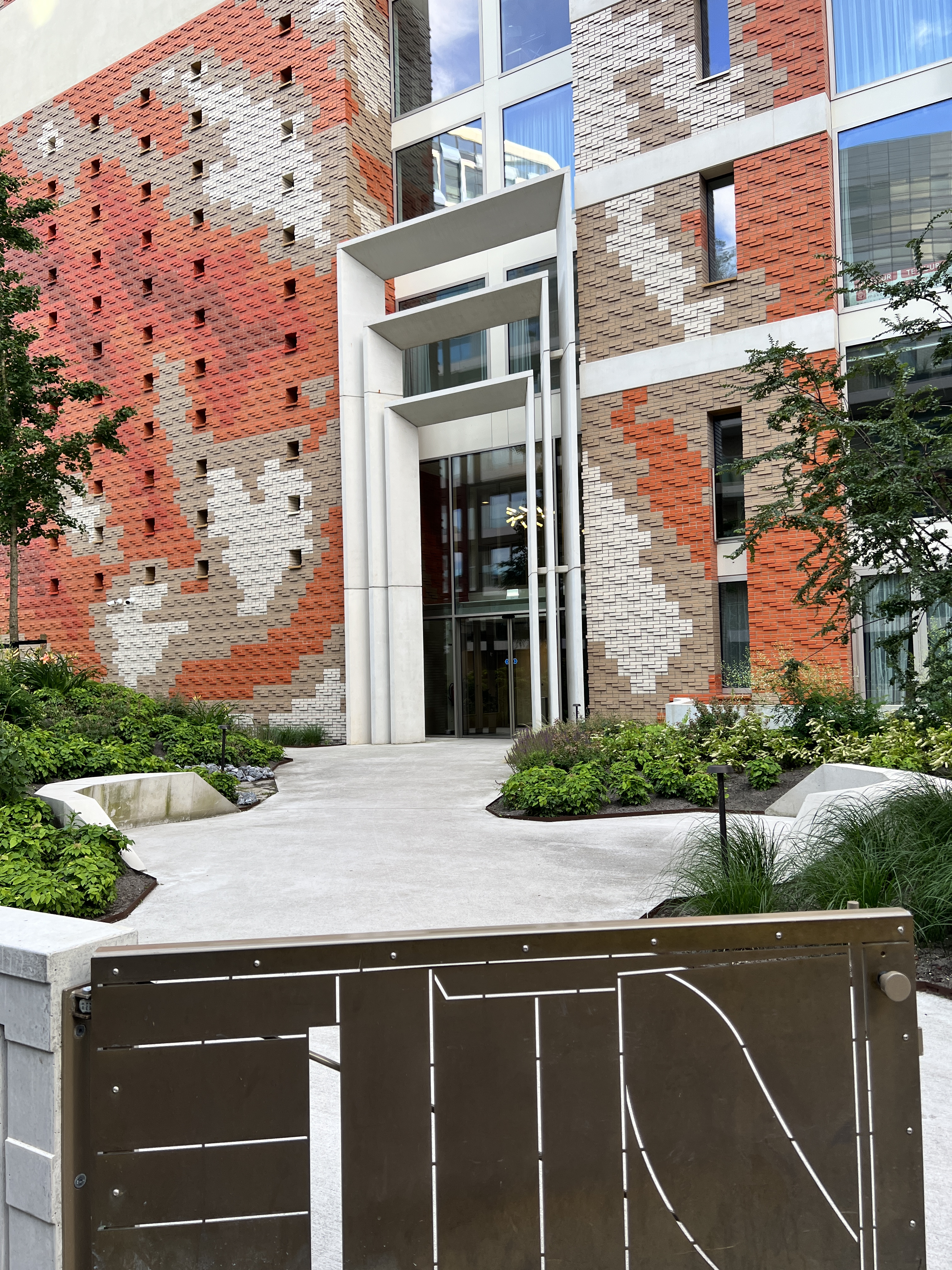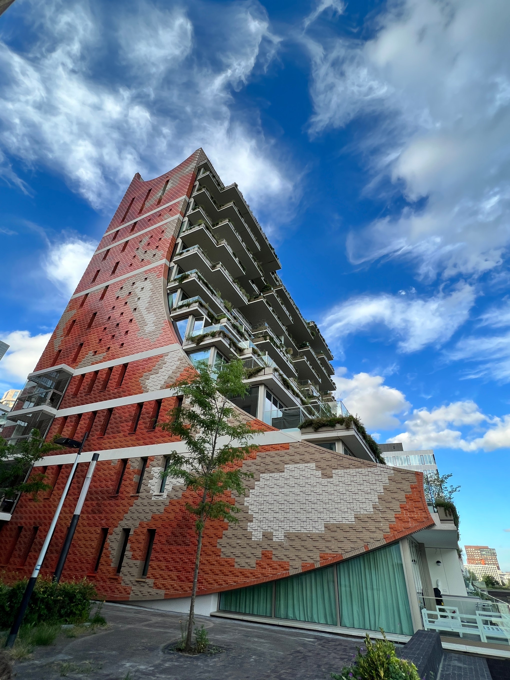 My reaction: “What the….?!” As buildings go, this one really raised some eyebrows for me, in a good way. Approaching the building- it’s the pattern and choice of color that catches the eye… and then the texture achieved through the brick… and then the canal facing layout with the C curve facade.