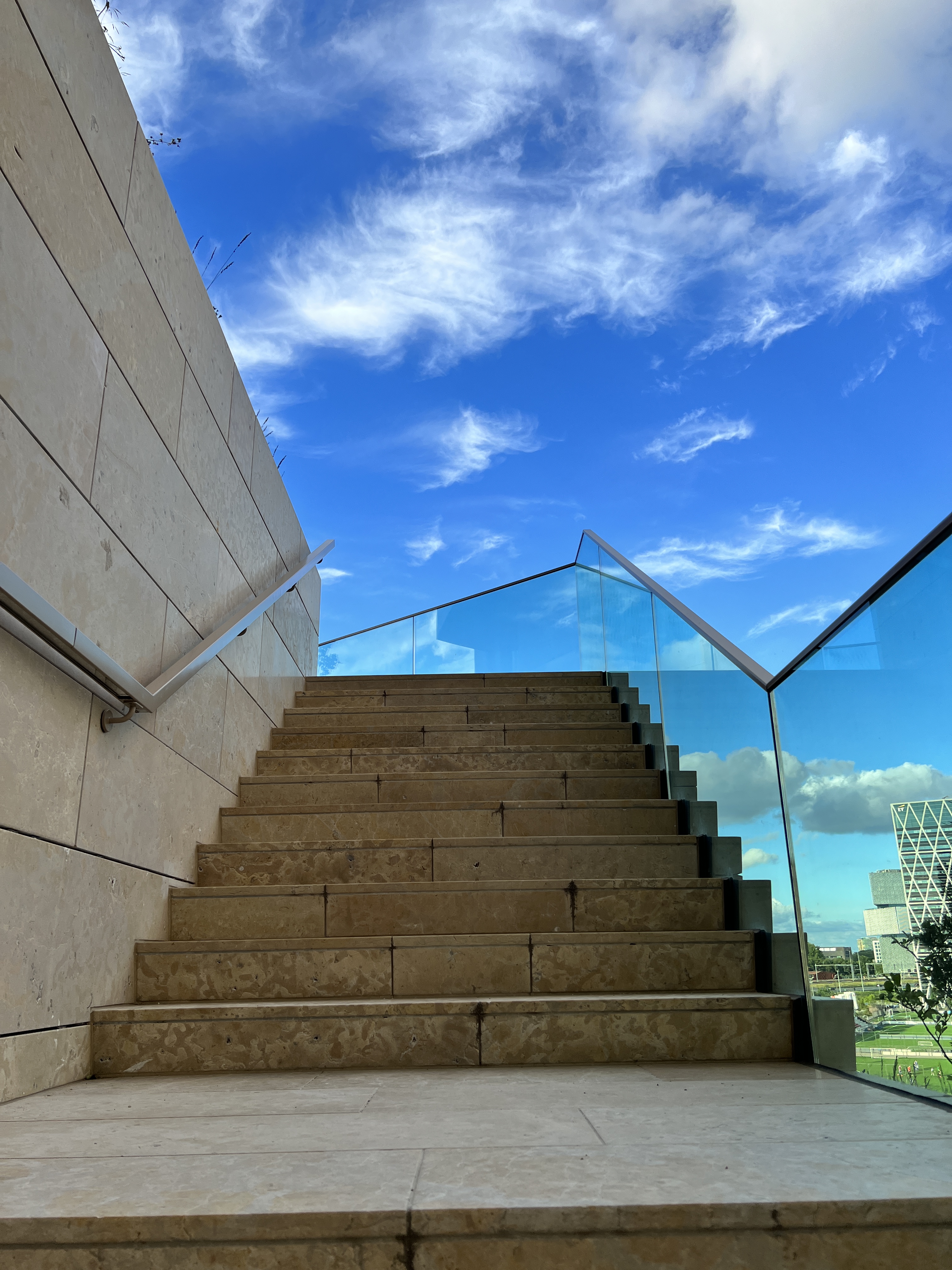 I get curious. I had a feeling there had to be more and unless labeled otherwise, if there’s a path that intrigues me, I’ll take it. And in this case, it was a seemingly harmless set of stairs… that was not one set, or two, but kept going (hence my estimate about the 6 stories previously). Twisting and turning, we finally arrived on the terrace and a “valley” indeed. So this is the space that the building is named after. It all clicked.
