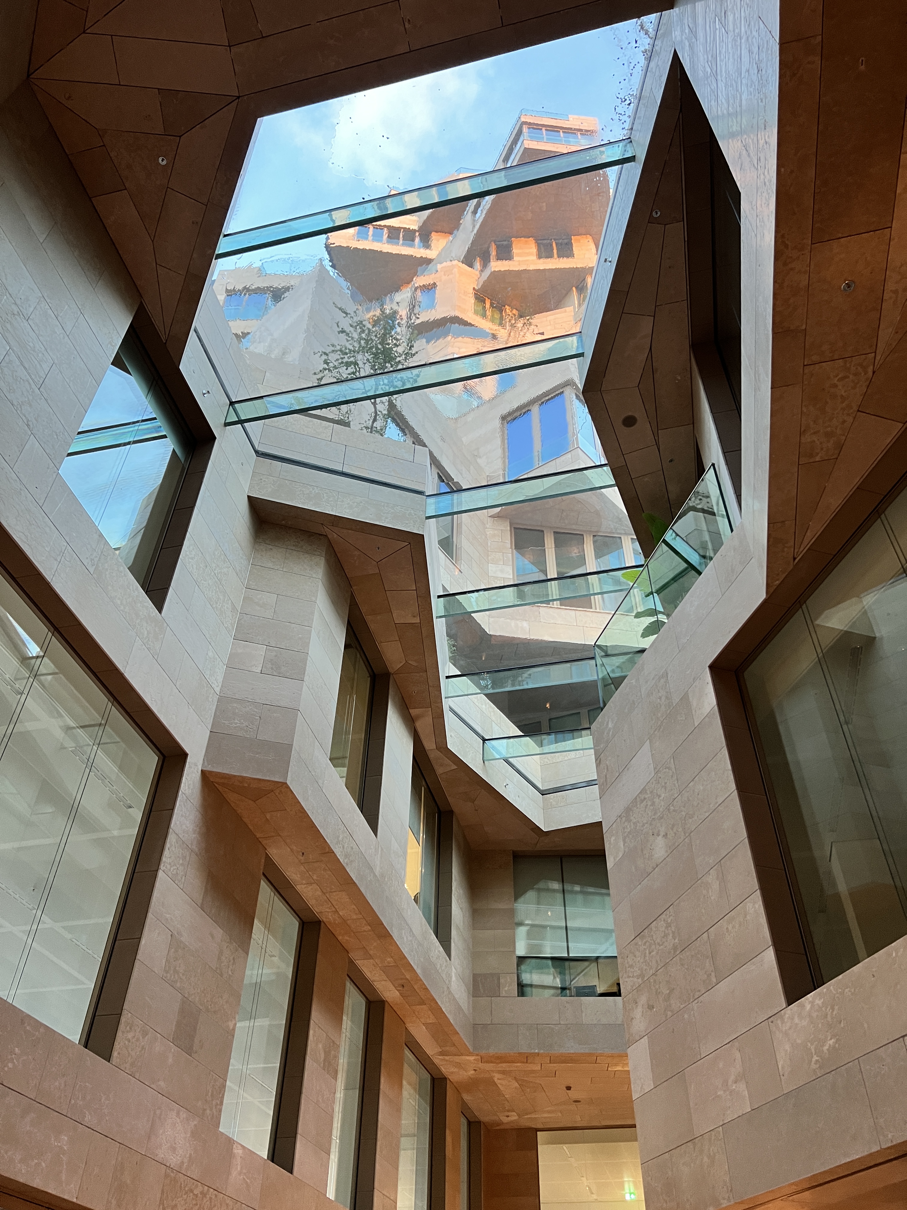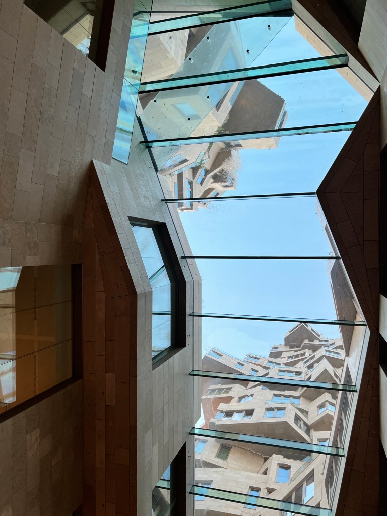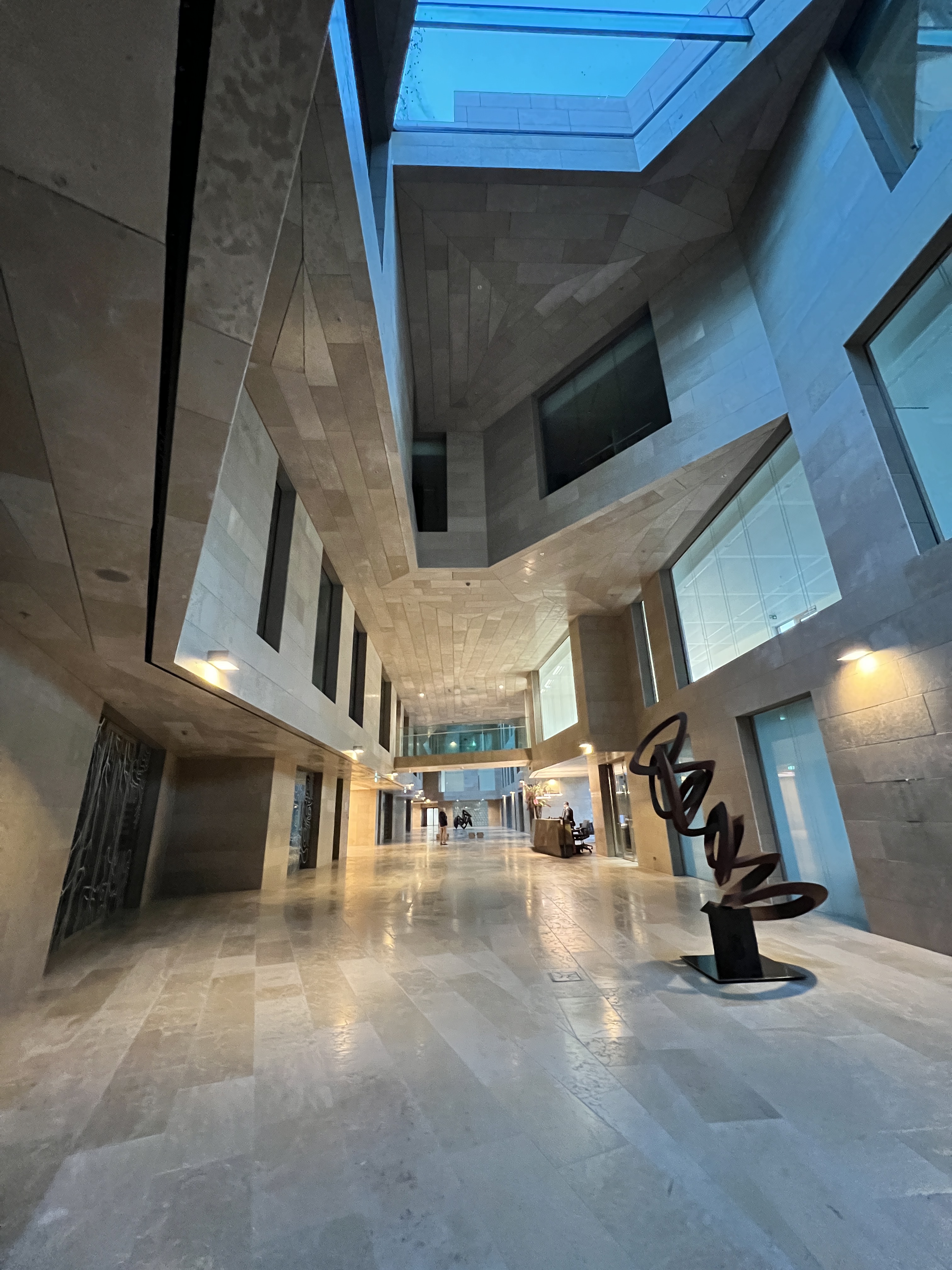 Inside the lobby it was so quiet you could hear a pin drop. The metaphor of the valley continued even inside- connecting the inside and other together creating continuity. What added to this also was the choice of material which seamlessly created the connection. The imagery that comes to mind is that scene in Indiana Jones where they ride into a valley (which I learned is a sandstone canyon called Siq). The experience was so intimate, empty and it felt entirely mine- an incredibly special moment in time for me for some inexplicable reason.