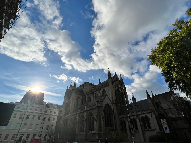 More than anything on this walk, I was continuously grateful for the weather. A perfect sky- partly cloudy, the sun shining so bright providing light and shadow everywhere I looked. The Church of the Christ of King must be beautiful on the inside and with the Queen’s passing, stopping into a church probably wasn’t the worst idea- but I was really running short on time. (plus, it was really a photo to capture the sky, lets be honest).
