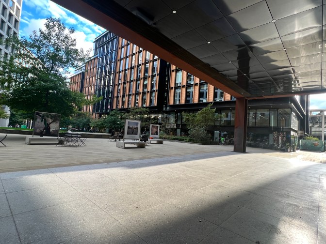 After hauling it here and pretty much making it on time, I took a few minutes to wander into Pancras Square- lured perhaps by the smell of tech (note sarcasm), notably the Google office. I really liked the reflective paneling on the ceiling of this passageway… the capture of light here in so many different ways from the blueness of the sky, the long light down the passage then reflected onto the ceiling and back down again.