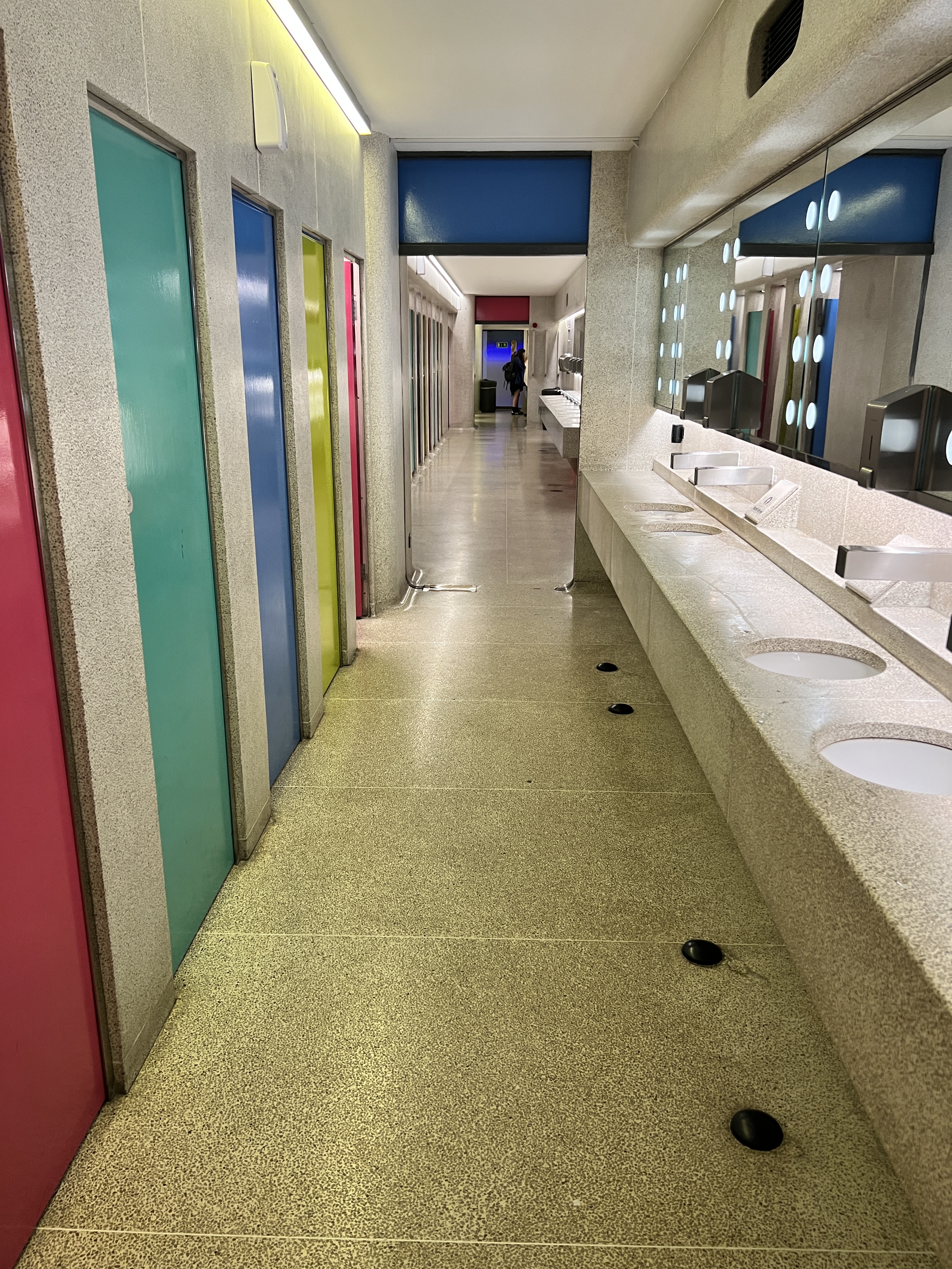 Brutalism. The style of note. The austerity of the exterior (also noted in this building at University College) did not prepare me for the blasts of intense color on the interior. The bathroom in particular being a high point of this.