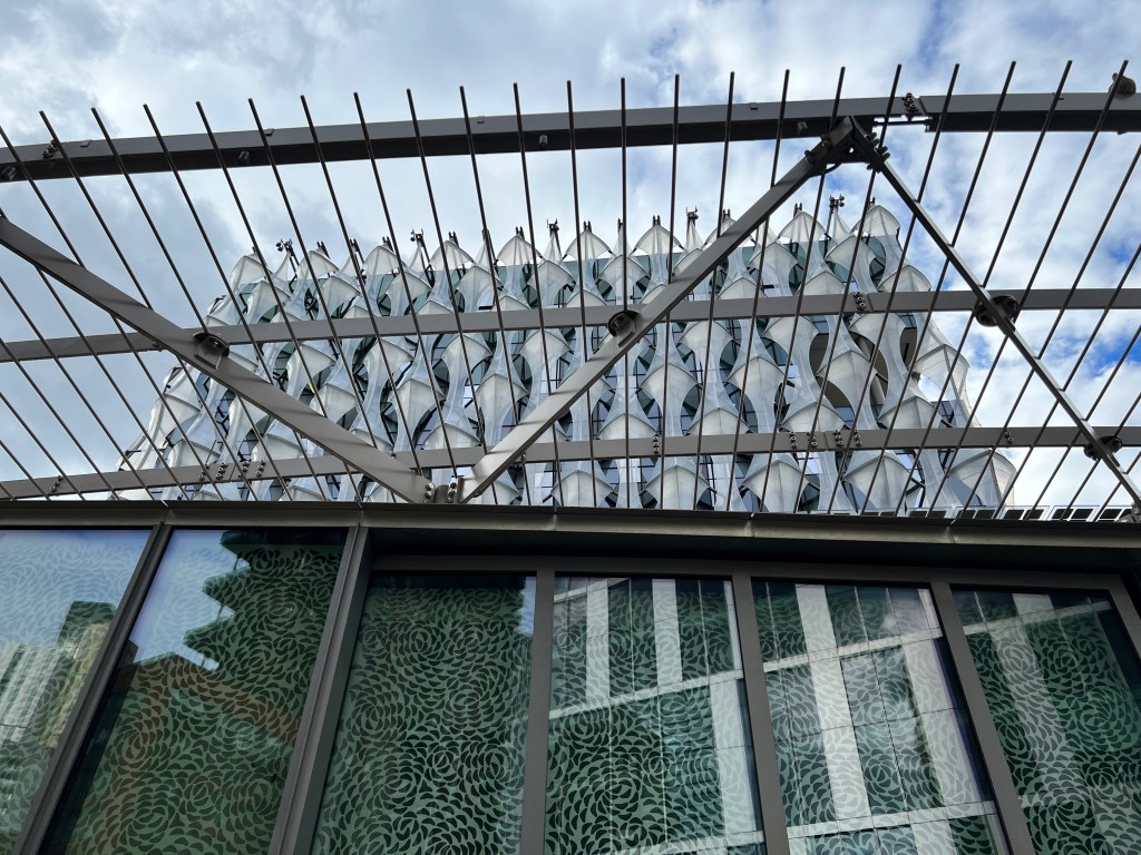 What caught my eye about this building from afar was the skin-like membrane on the exterior of the building. The sunlight helped to communicate that the skin was translucent. Interestingly, only on 3 sides of the building.