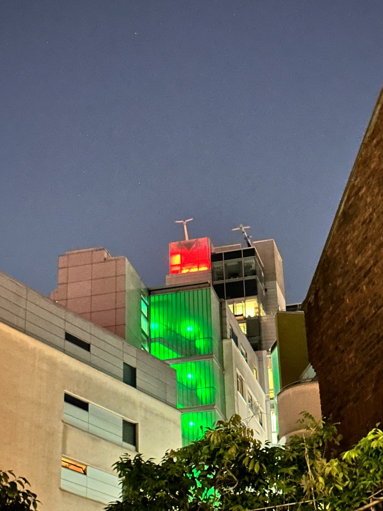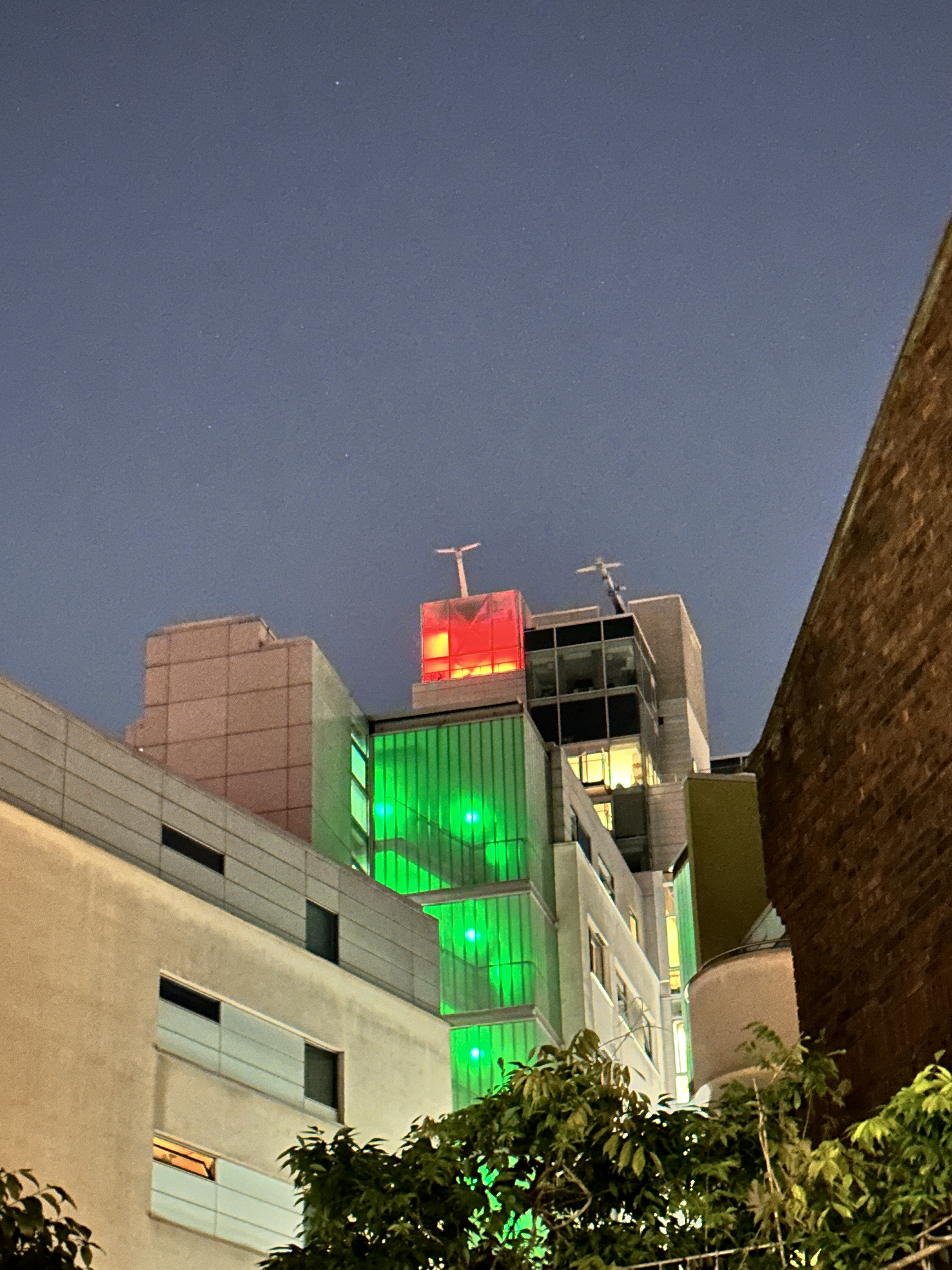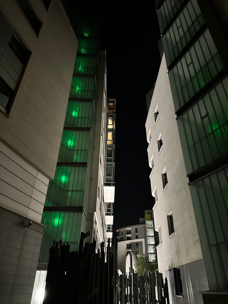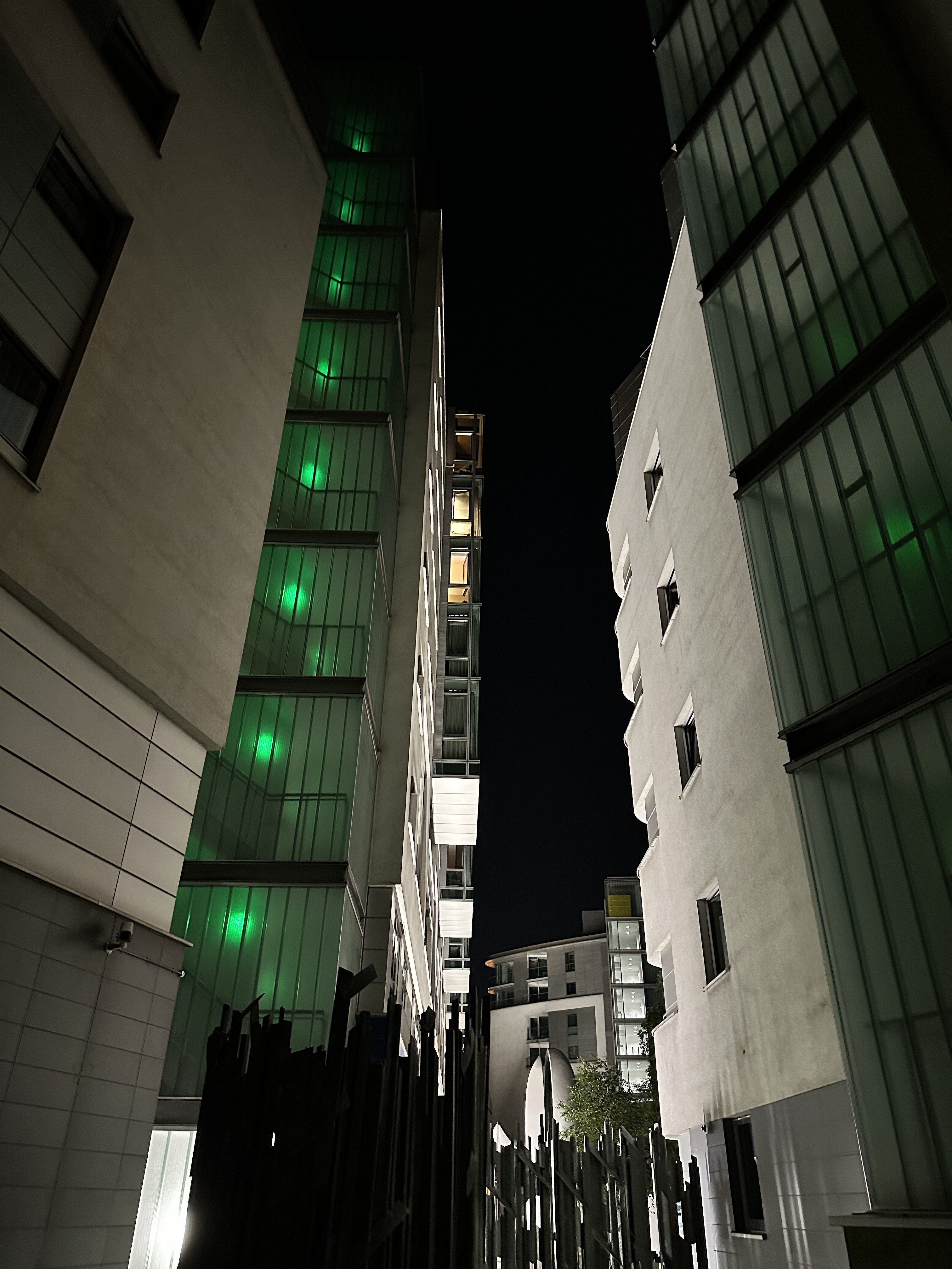 Back to the purpose here, the green light of this building caught my eye enough to wander closer- I was curious about the material of the stairwell and how the lighting was being created. Turns out the material was a wavy textured thick plexiglass type and the green light was actually for standby- green turned to white based on detection of motion.