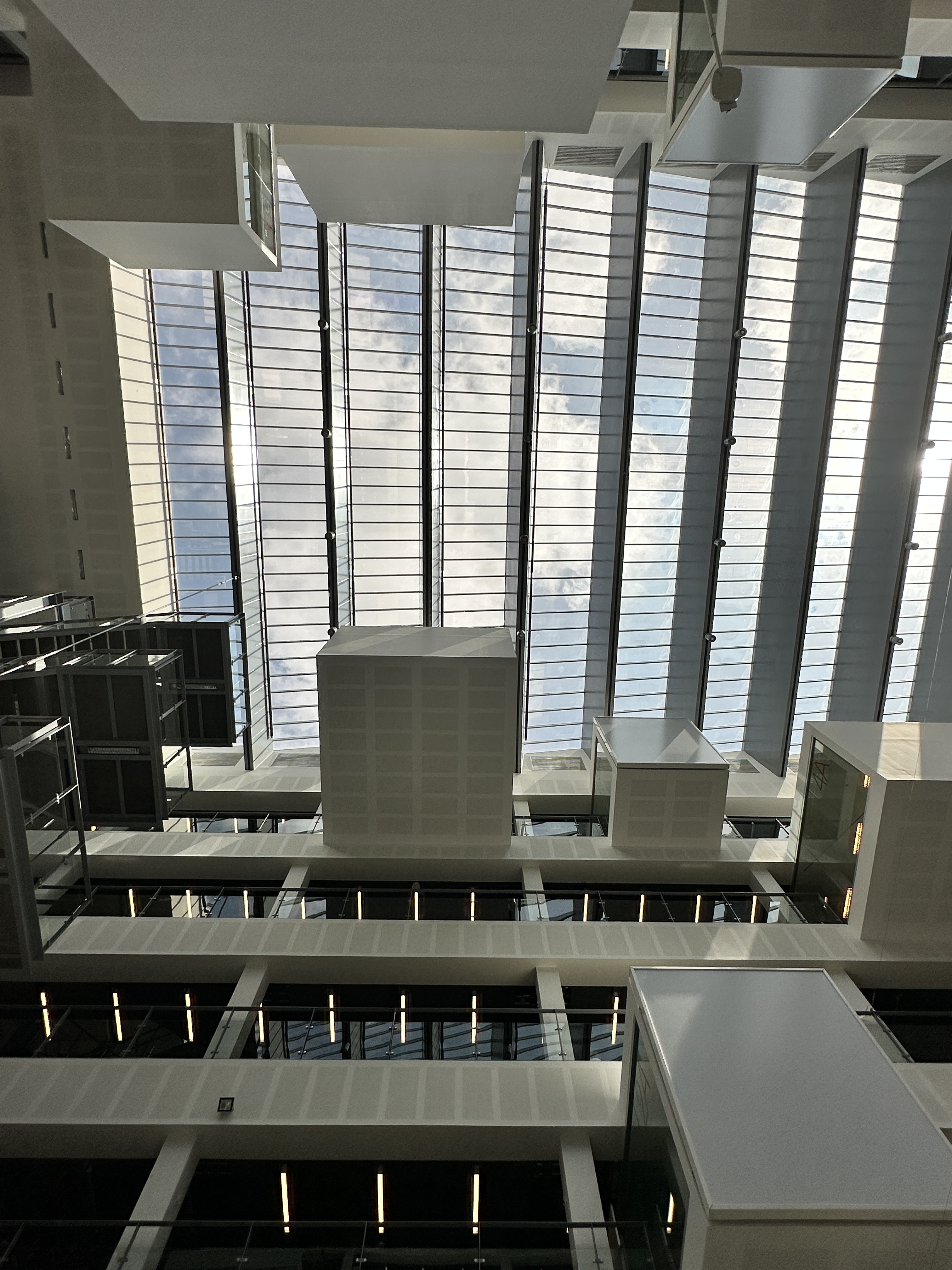 It’s interesting when we build in versus out. The protruding boxes towards the interior of the atrium always fascinated me- what would it be like to sit in one of those? Floating above with nothing but some steel support between you and a deathly drop. Well, my courage didn’t take me as far as cracking open one of the doors to sit in one, but I learned that they are enclosed and set up as meeting or group spaces.