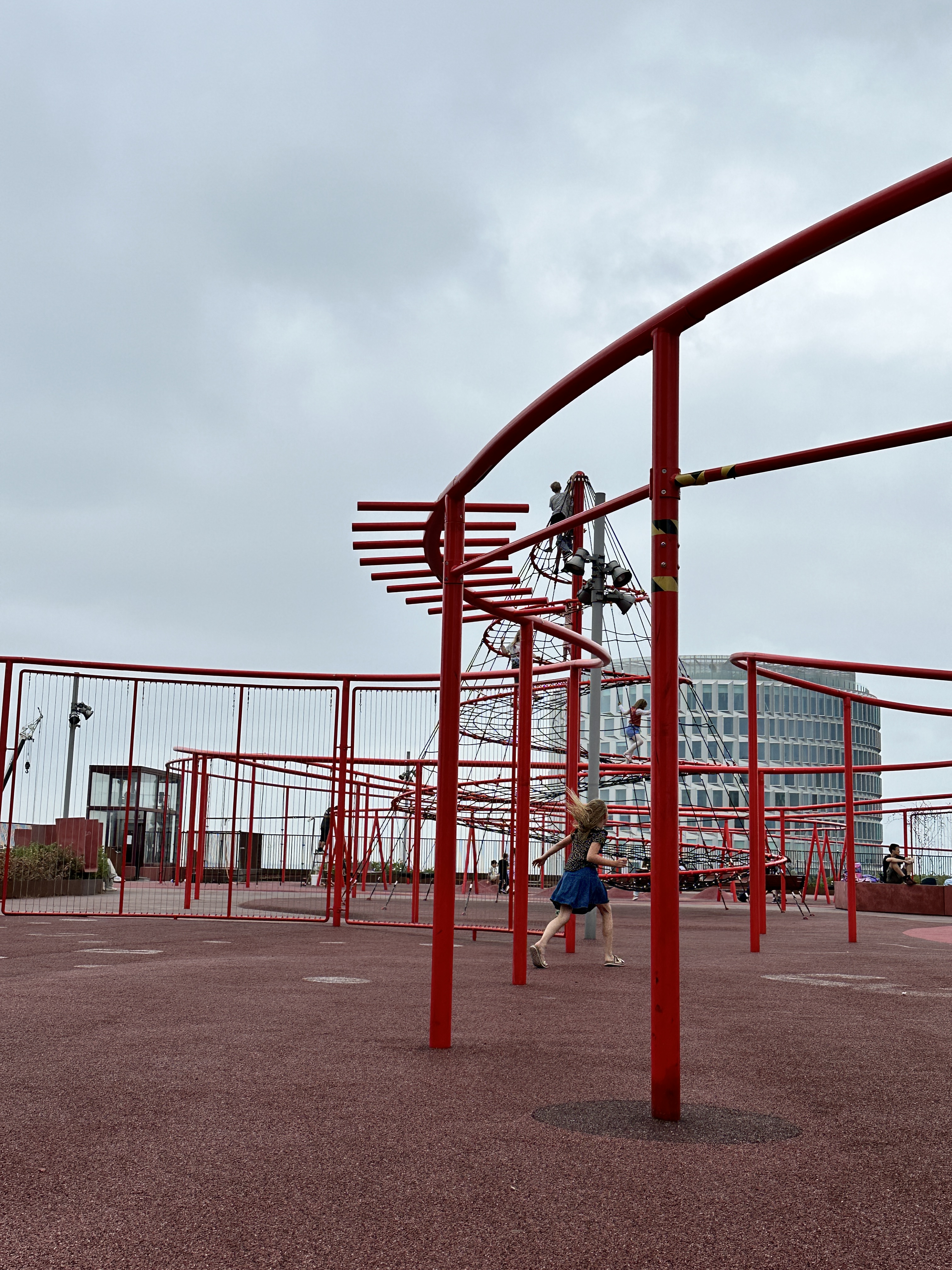 The views from the rooftop are 360 degrees and give a great overview of the amazing breadth of architecture in the neighborhood. I wish the weather wasn’t spitting rain and windy because I think we would have spent a lot more time here. I don’t have more pictures of the playground itself to be respectful of the children there, but adult or child- if you are in this neighborhood, come find this playground. You’ll find yourself feeling a little lighter (inspired by the design concept), a little uplifted (on a rooftop) and a little filled with glee (jumping around trampolines).