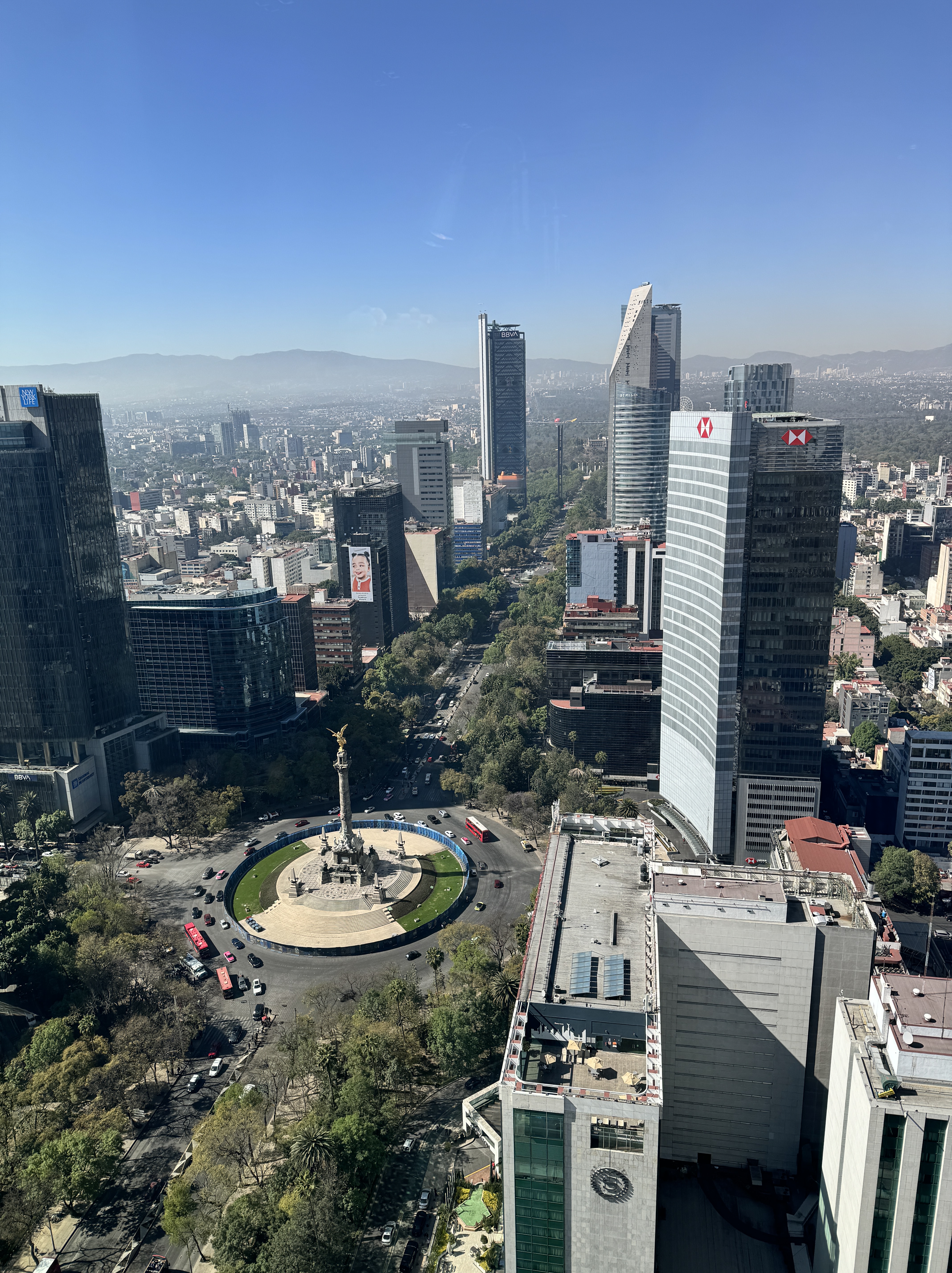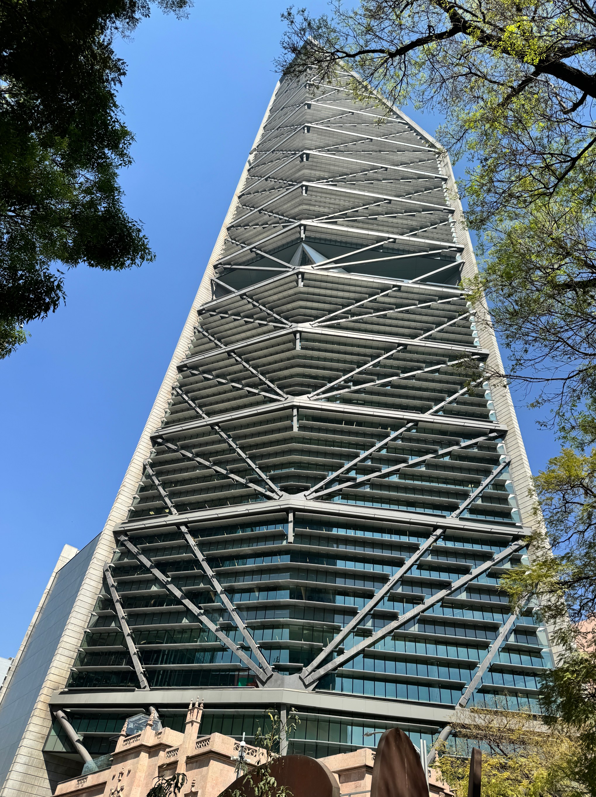 When I scanned over the skyline of the Reforma and surrounding neighborhoods, one building immediately popped out to me an an anomaly – wedge shape at the top and almost no windows on an entire side. Sure I’ve seen pretty monolithic materials on builds but never on a skyscraper like this. My curiosity was peak levels.
