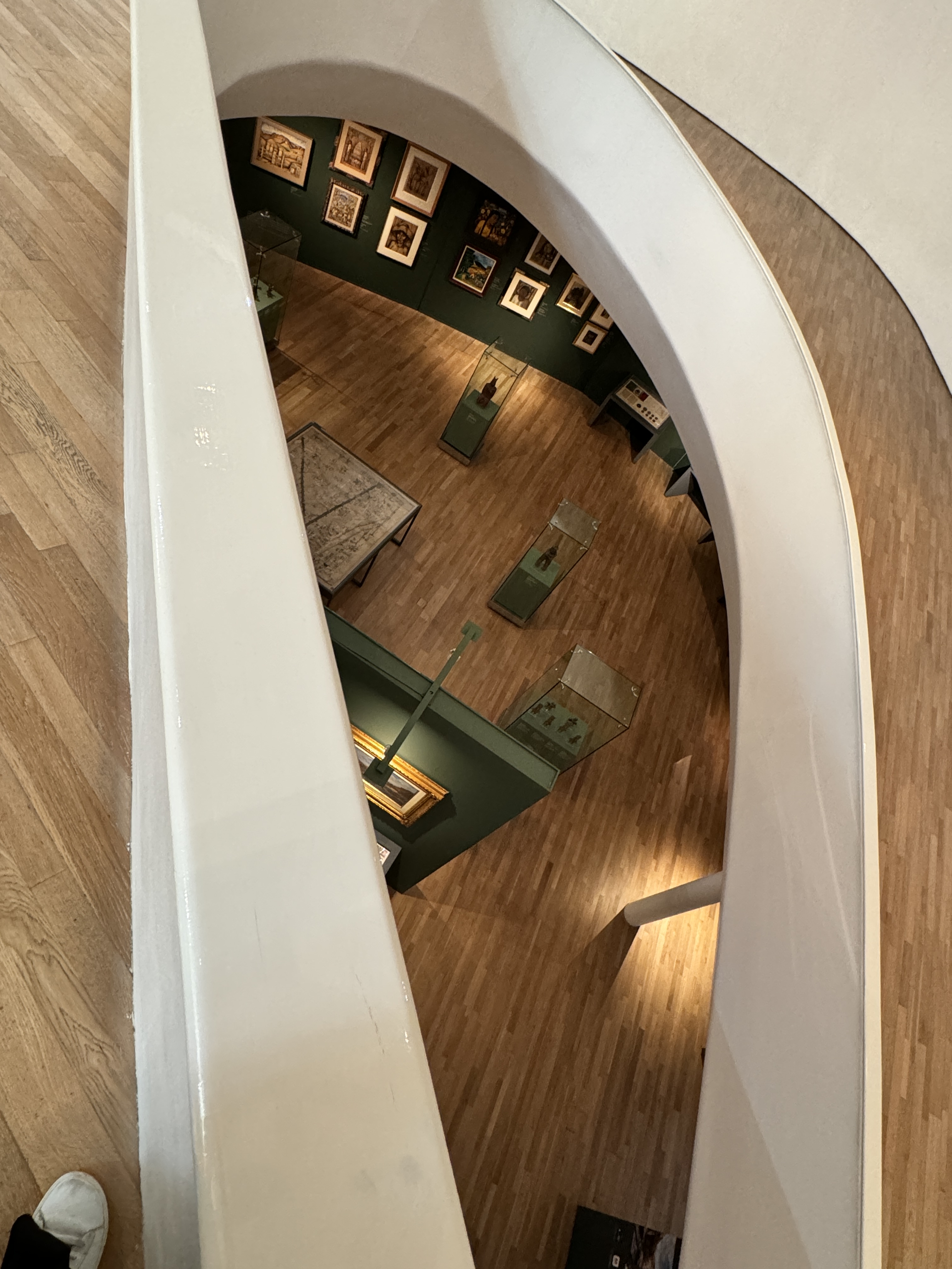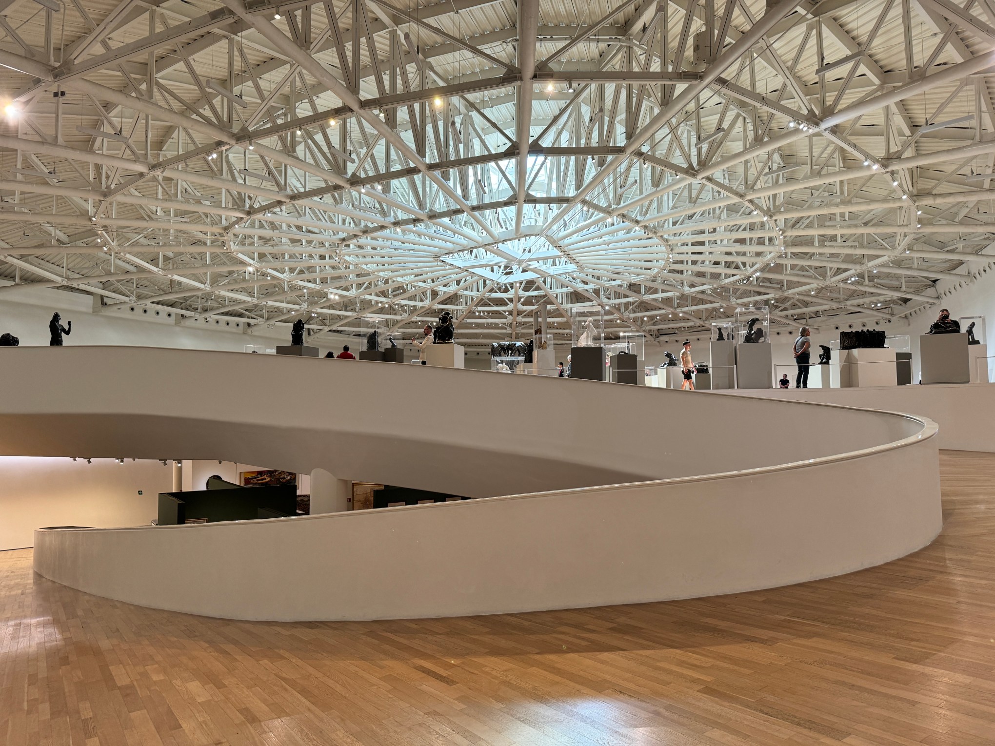What I love most about this building is the navigation through the spaces. No stairs (except for the grand staircase), all floors designed with ramps as the key experience- a perfectly accessible design like the Guggenheim in New York. Round and round, and round and round again- I could not believe how many floors there were as the building did not convey just how room there would be on the inside from the outside. I kept asking myself “how many more floors are there?”- astounded- as I was really chasing after the top floor of this building. I knew there was something at the top of it all (felt like I was summiting a mountain).