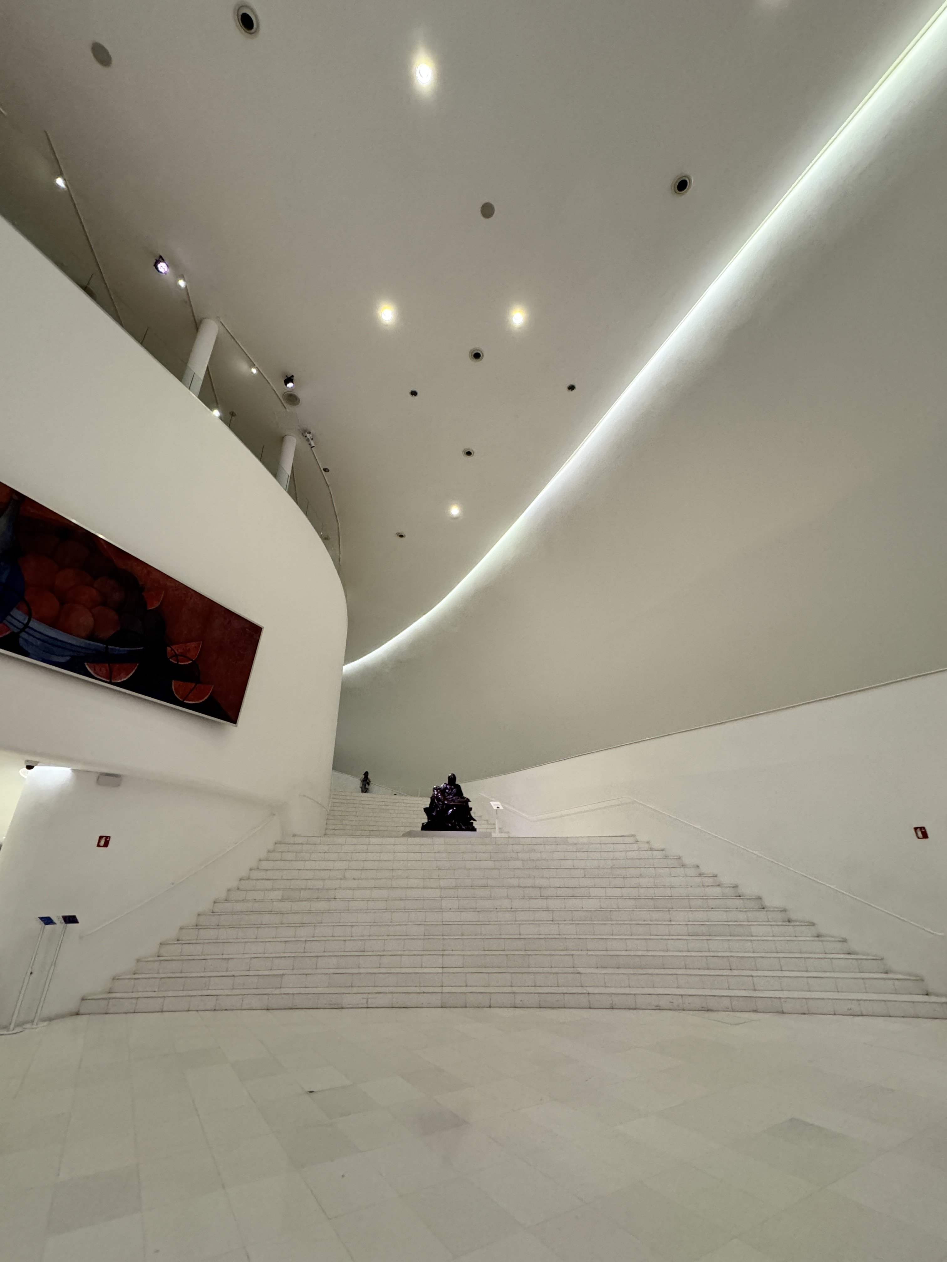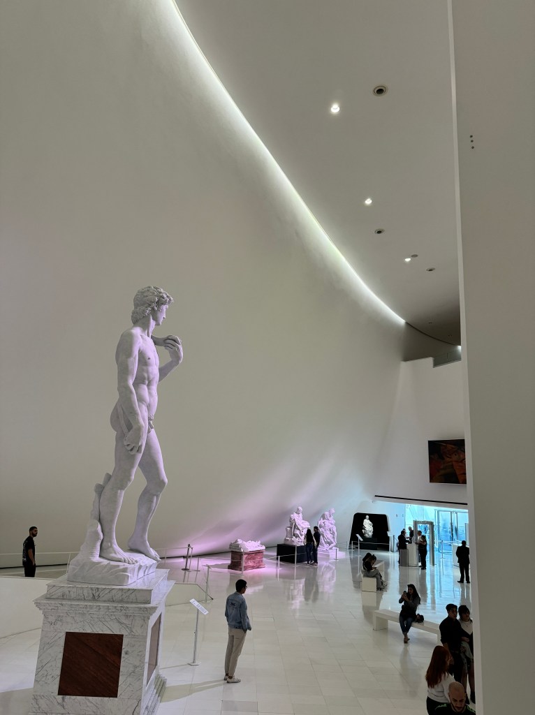 The building seems really small from the outside, but it actually feels quite enormous on the inside. Somehow the architects have carried that sweeping silhouette into the massive entrance lobby area. The replica of David helped to emphasize a larger than life feeling. Also, a modern take on the grand entrance staircase, the v shape plays into the perspective leading the eye up into the space- also helping to pull the visitor up into the next exhibit areas.