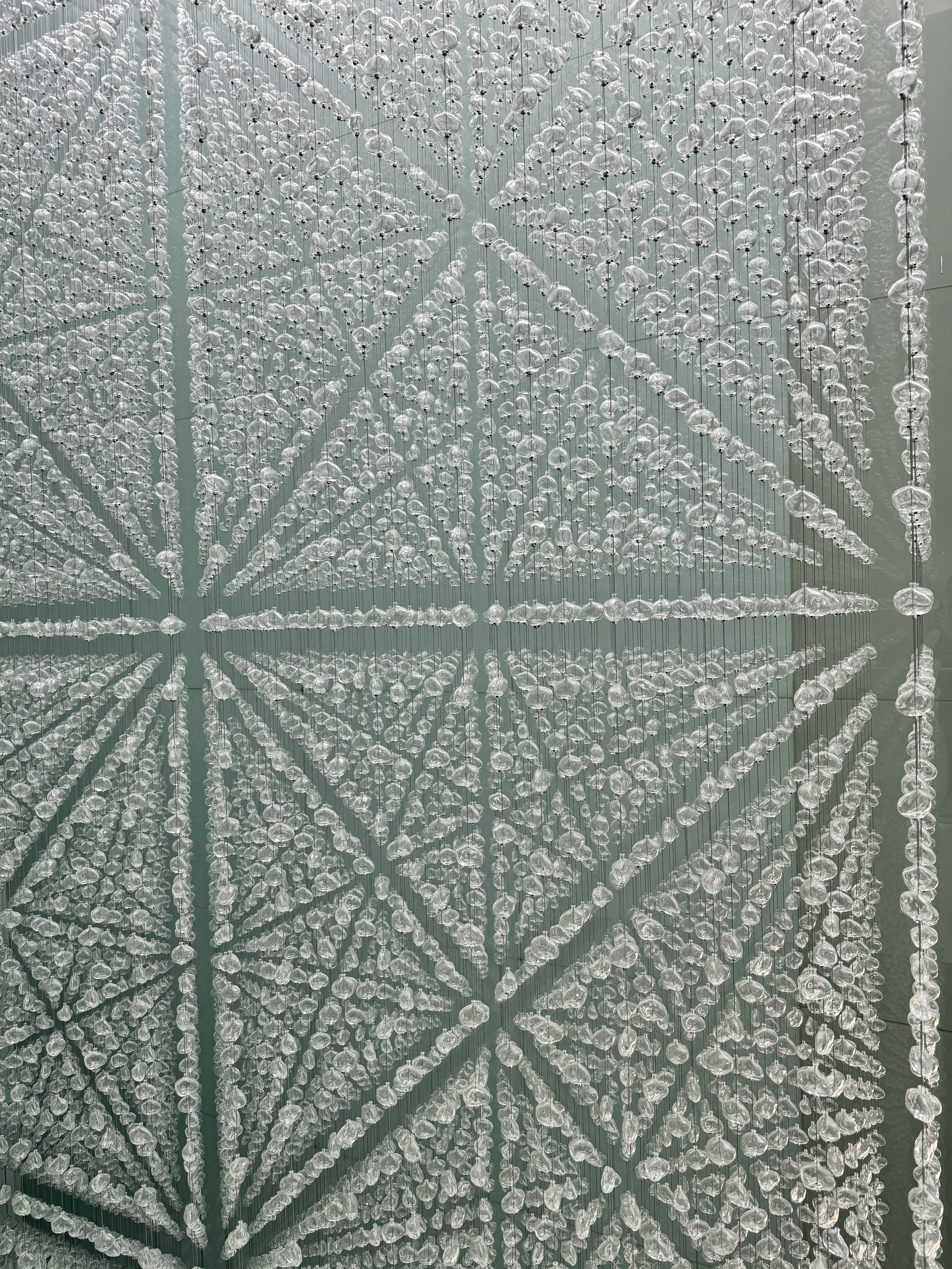 I didn’t read anything in this place, I didn’t stop of any videos or images- I couldn’t stand the intensity of feeling alone. But there were two spaces with no text or video or images and I will never forget them. The first is the above installation- the dark black hole with the light far far above. And not far from that entering into the white floating box and the hanging fractal sculpture shrouded in light (see below)