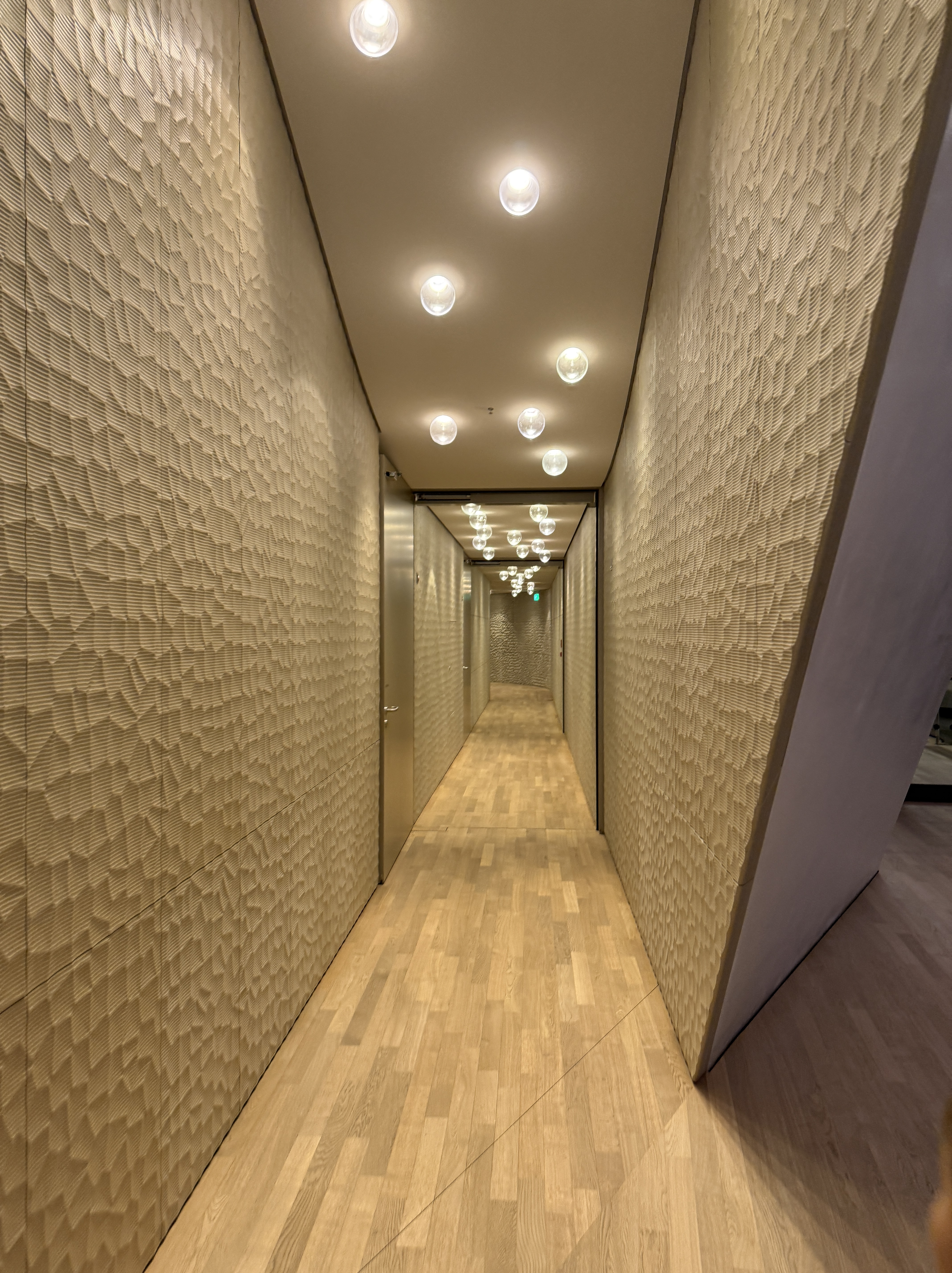 Contributing to the pin drop quality of sound are the beautifully textured wall sound proofing as well as some massive doors sealing in the space. I had to touch the wall texture- not sure if it would be soft or hard…
