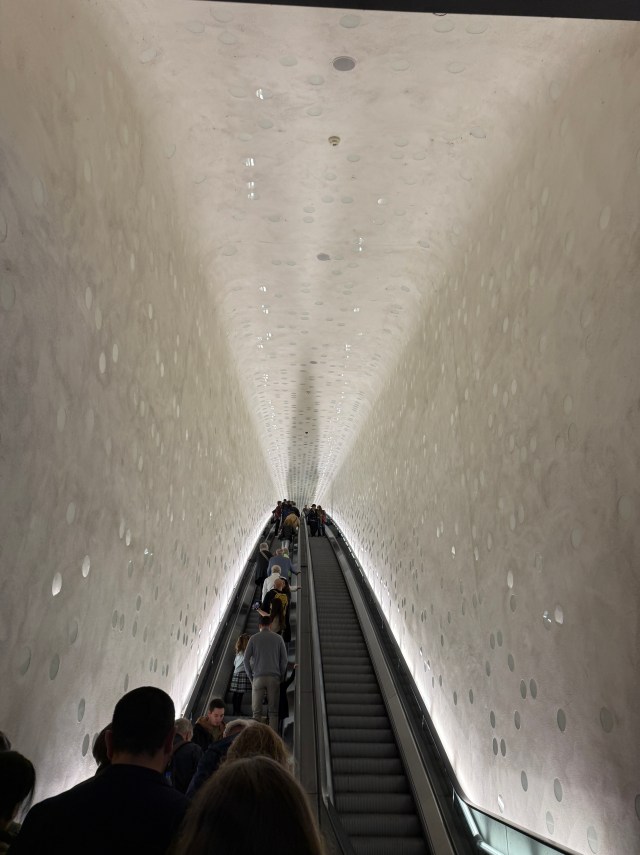The sections and plans for this building have to be something else. First the massive escalator, then one meandering set of staircases after another- there’s a sense of curiosity created as one journeys into the center of earth it feels like. When it dawned on me (not having actually seen the plans) that the performance center was literally a ball sitting in the middle of this buildings- I smiled with joy. Traveling to the center indeed.