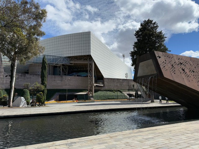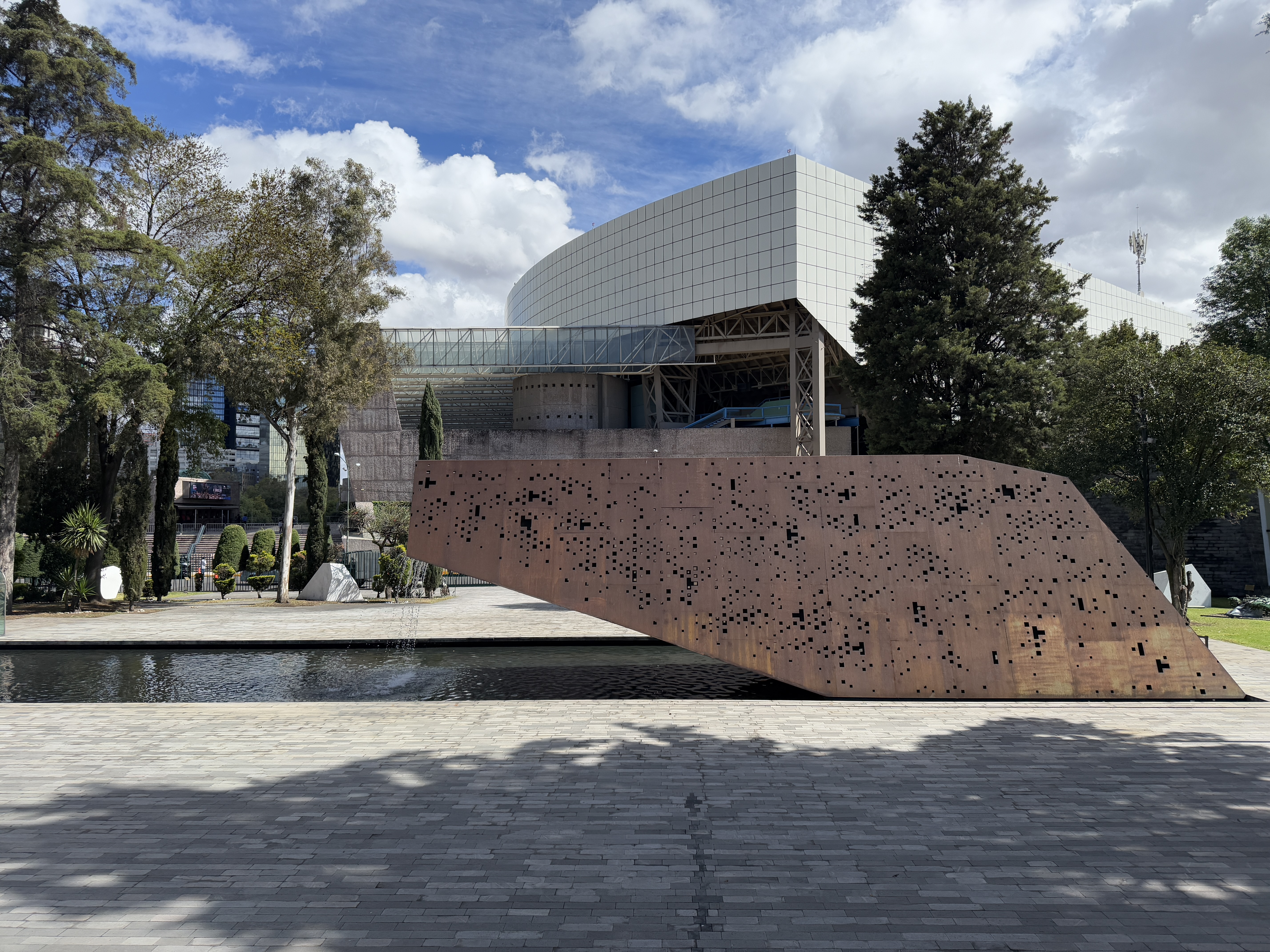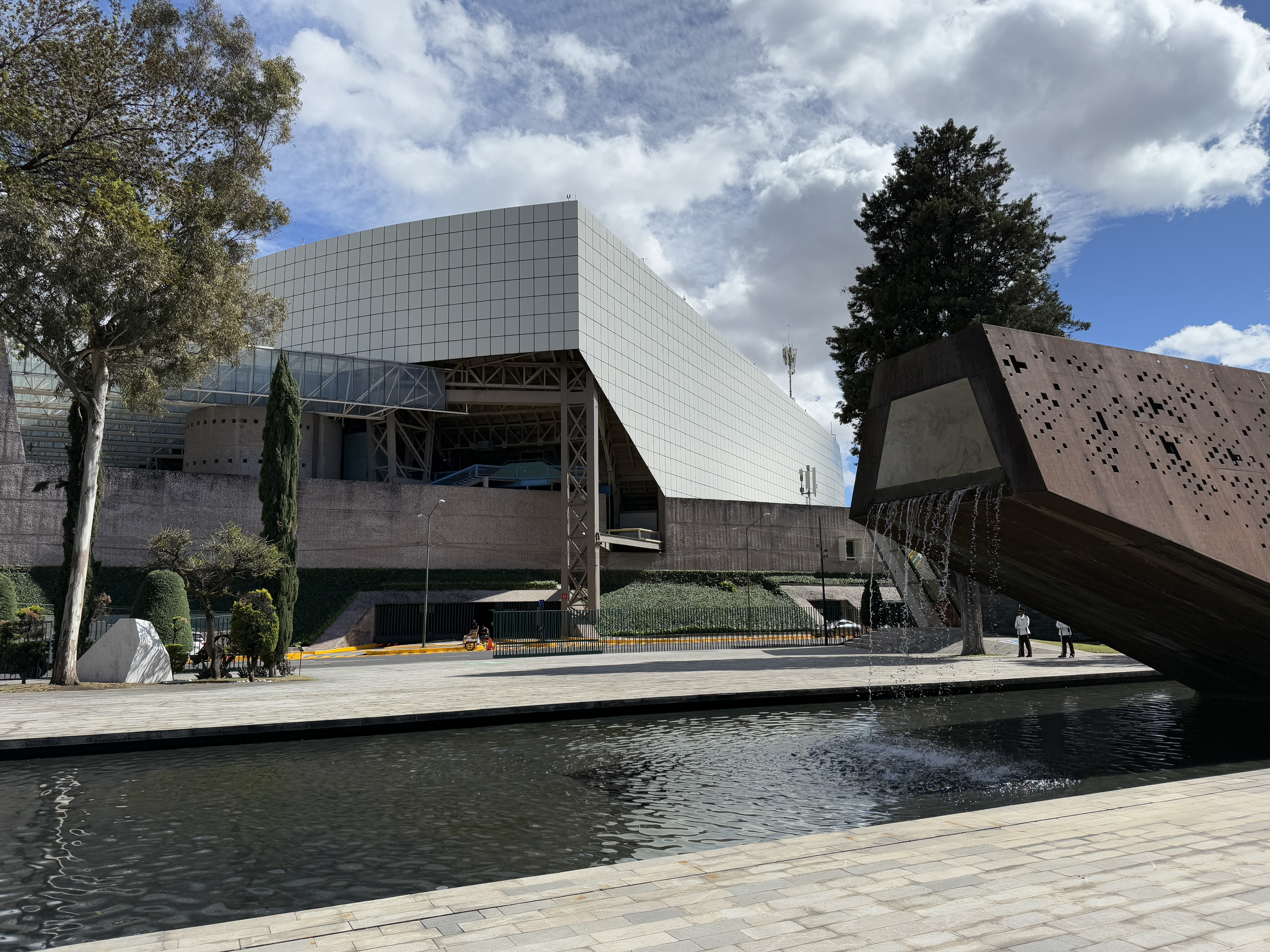 Getting a decent 270 degree walk around of the building, the building is actually best viewed from a memorial (Plaza del Servicio a la Patria) across the street. This memorial is worth visiting as much as the Auditorio itself. Guarded, it has an air of a little sadness, but of great honor and purpose. It welcomes reflection and loss and change – metaphorically through the water – but also to new life through the flame that burns within the sculpture.
