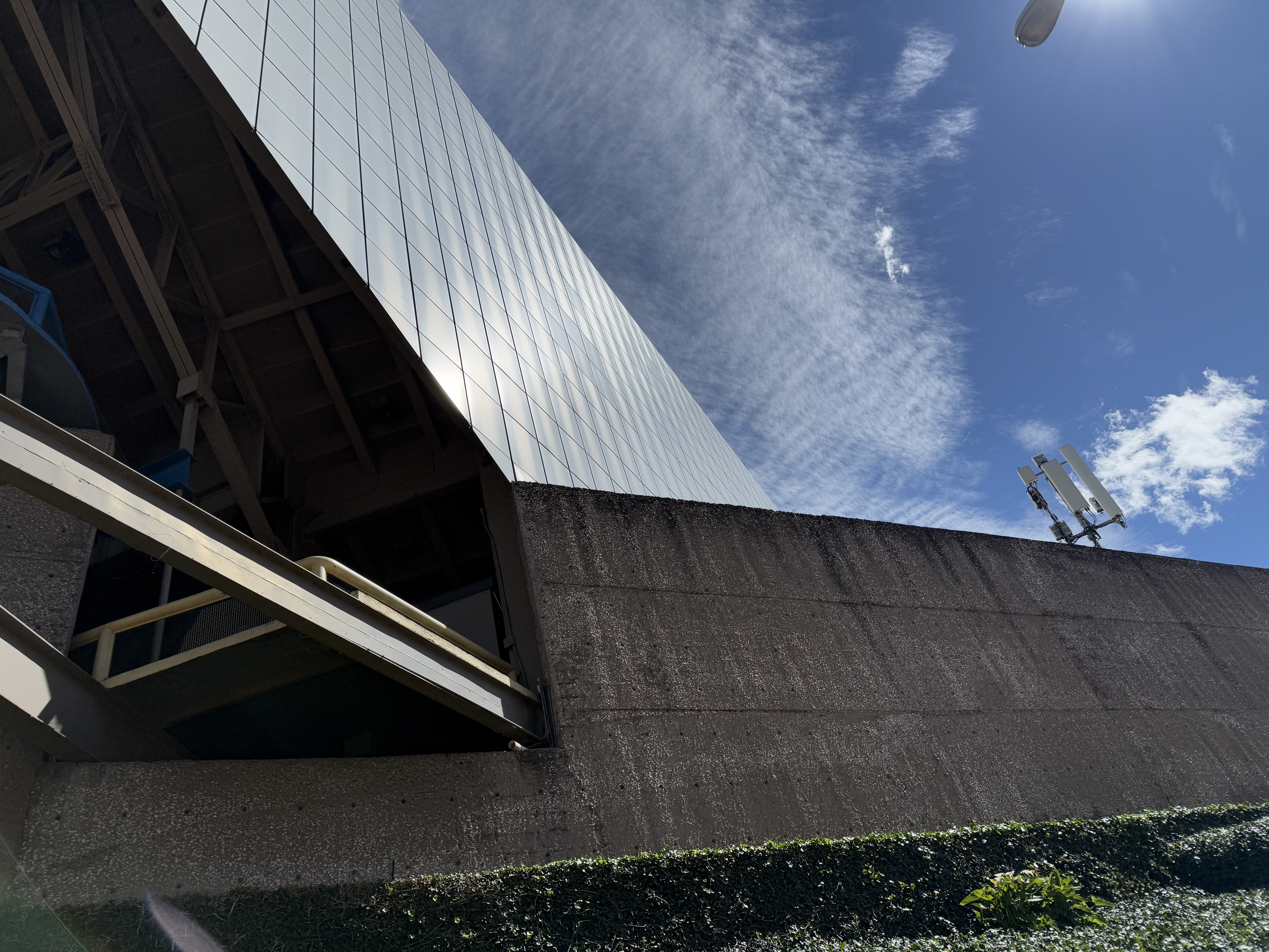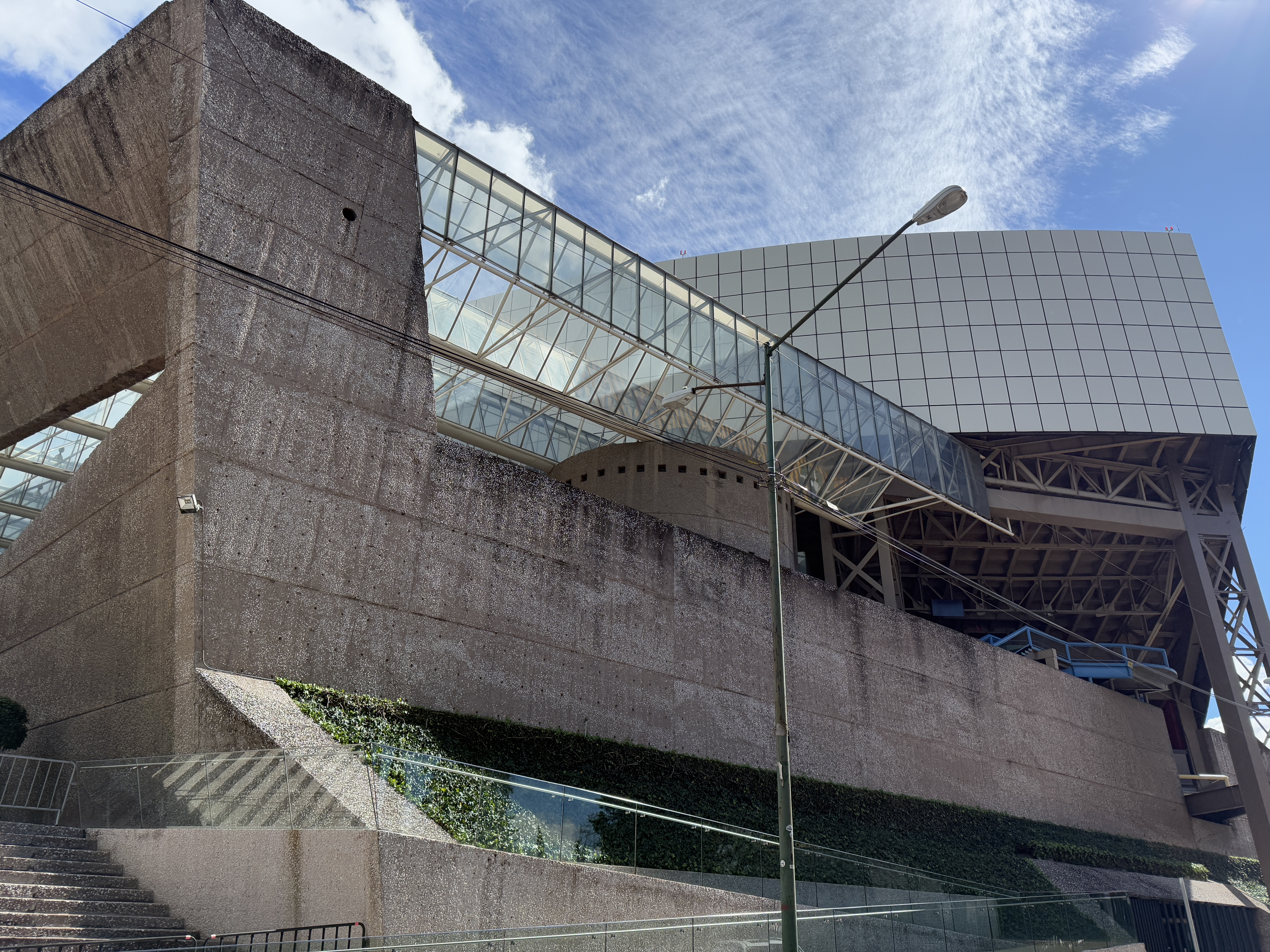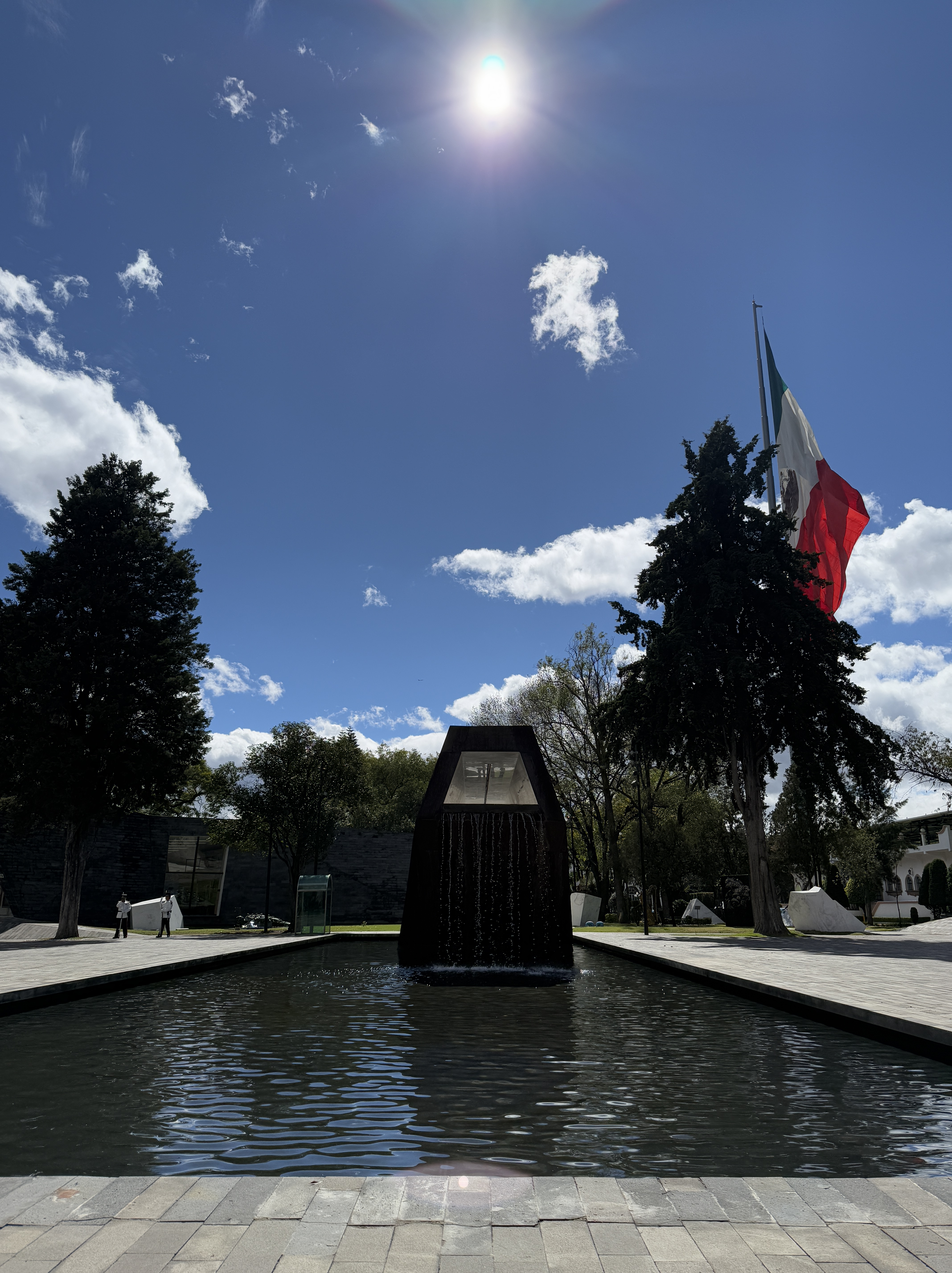 Getting a decent 270 degree walk around of the building, the building is actually best viewed from a memorial (Plaza del Servicio a la Patria) across the street. This memorial is worth visiting as much as the Auditorio itself. Guarded, it has an air of a little sadness, but of great honor and purpose. It welcomes reflection and loss and change – metaphorically through the water – but also to new life through the flame that burns within the sculpture.