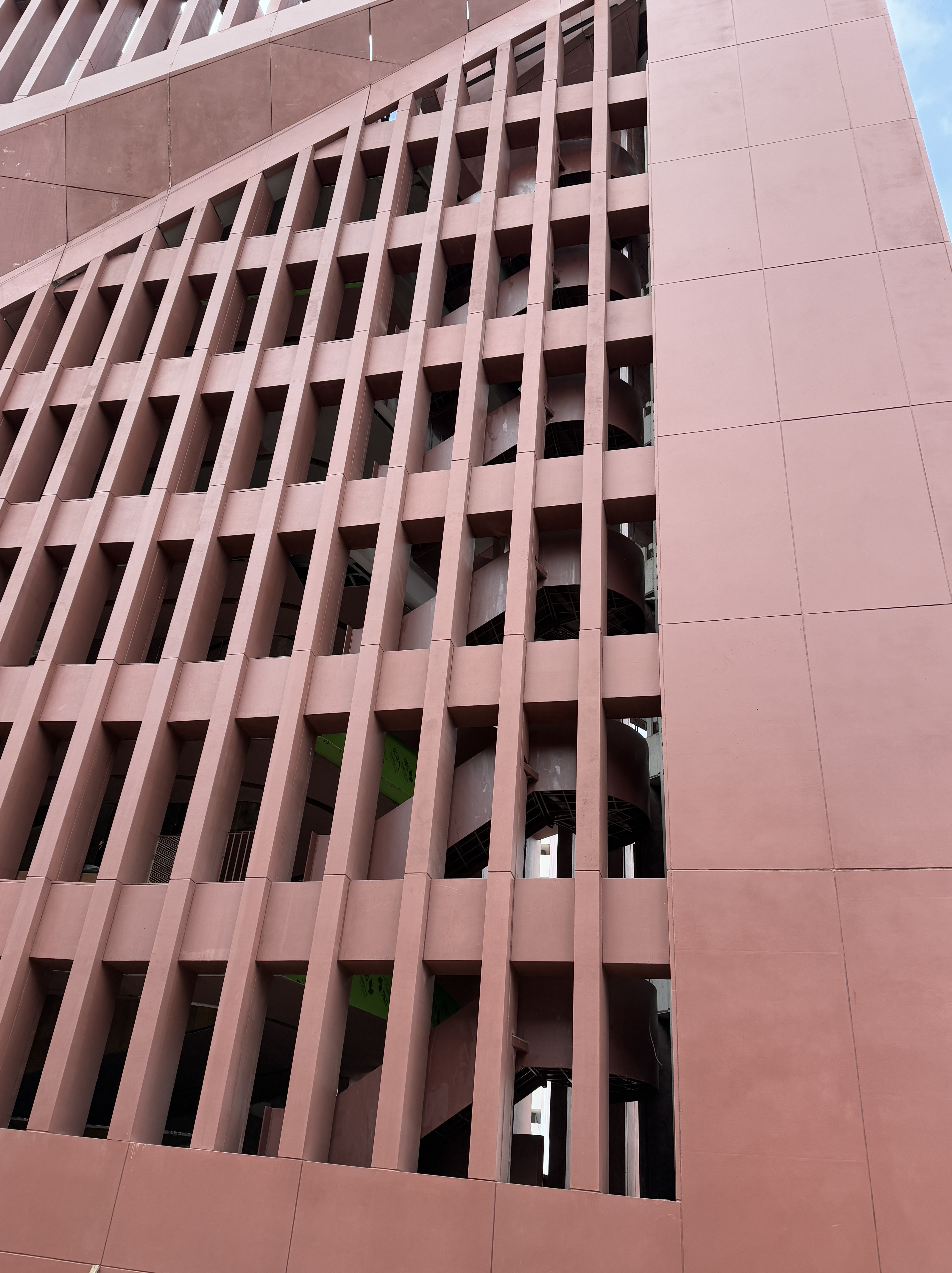 I’m so curious what the internal functioning space. Like many other buildings in Mexico City, various spaces are not enclosed from the elements but rather just protected. The heat and inefficiency of air conditioning likely presents a constraint within in which design can excel. The stairway peaking through the lattice serves as an example of this.