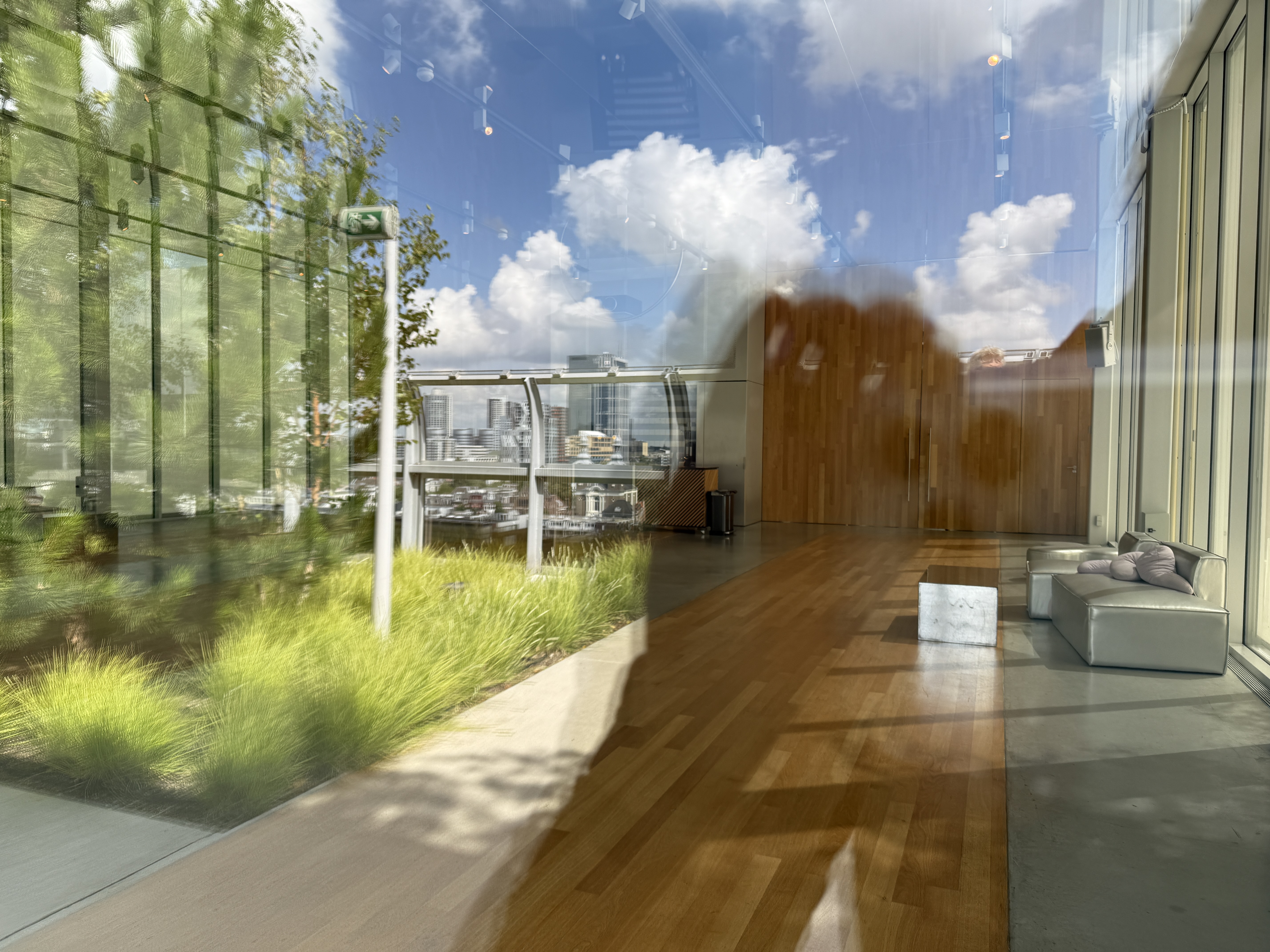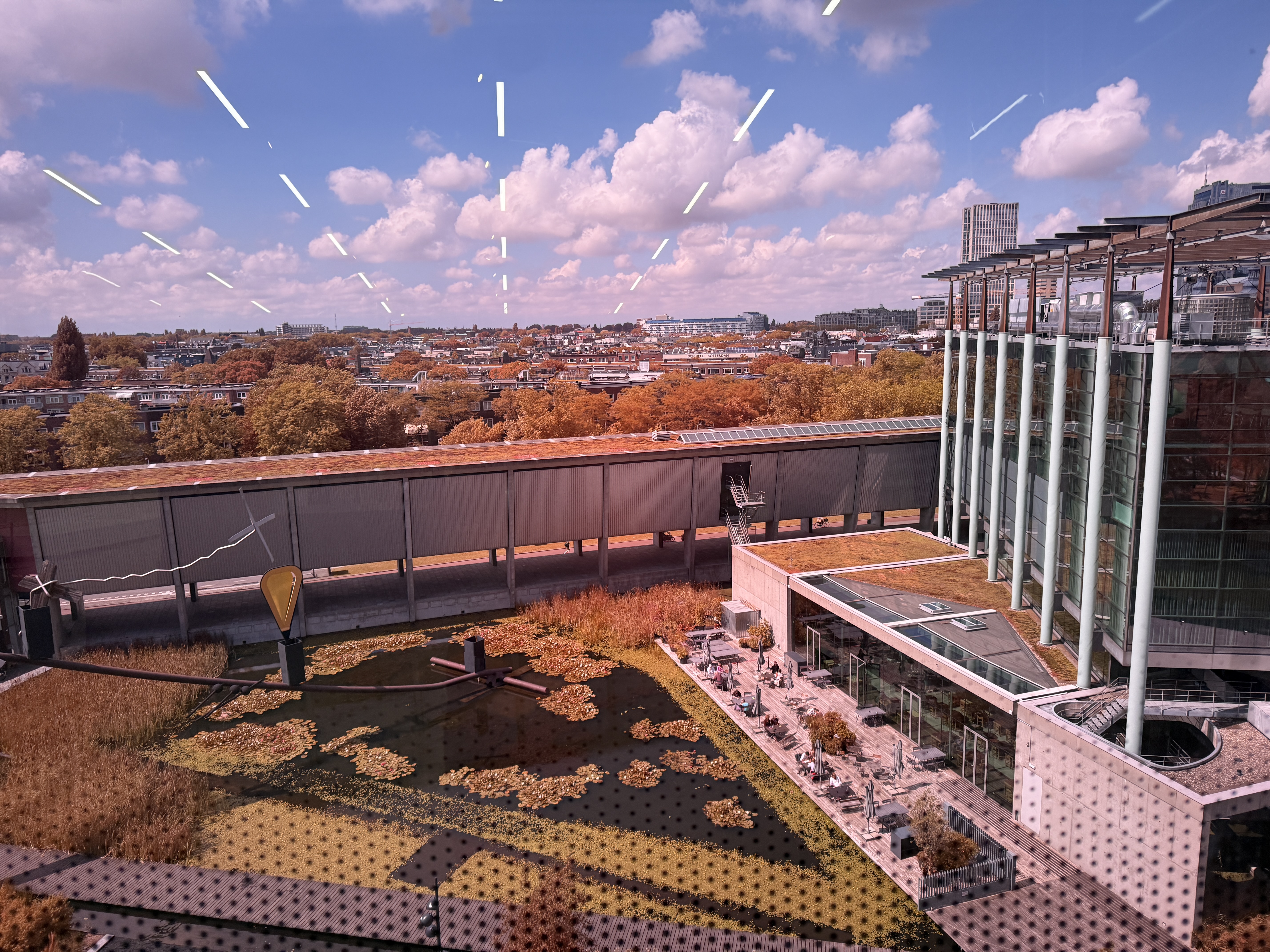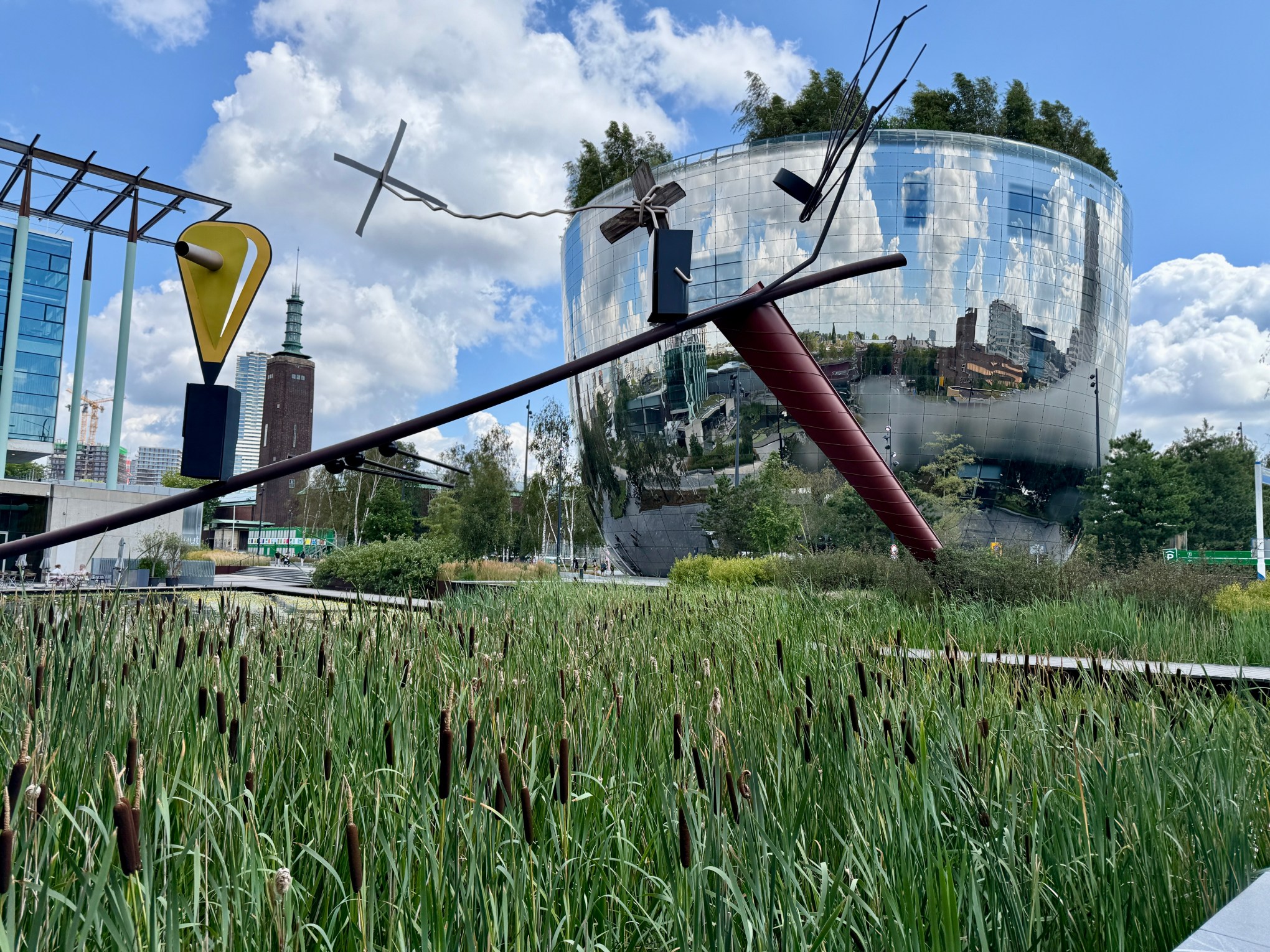 And the fun continues outside on the roof. The magnificent mirror material covers almost the whole curved building also wraps the top floor exterior that reflects without a glare the surrounding trees giving a sense of being a bit lost- careful to stay on the path though the mirror draws you into a forest that doesn’t exist. There are some great views of Rotterdam all around.