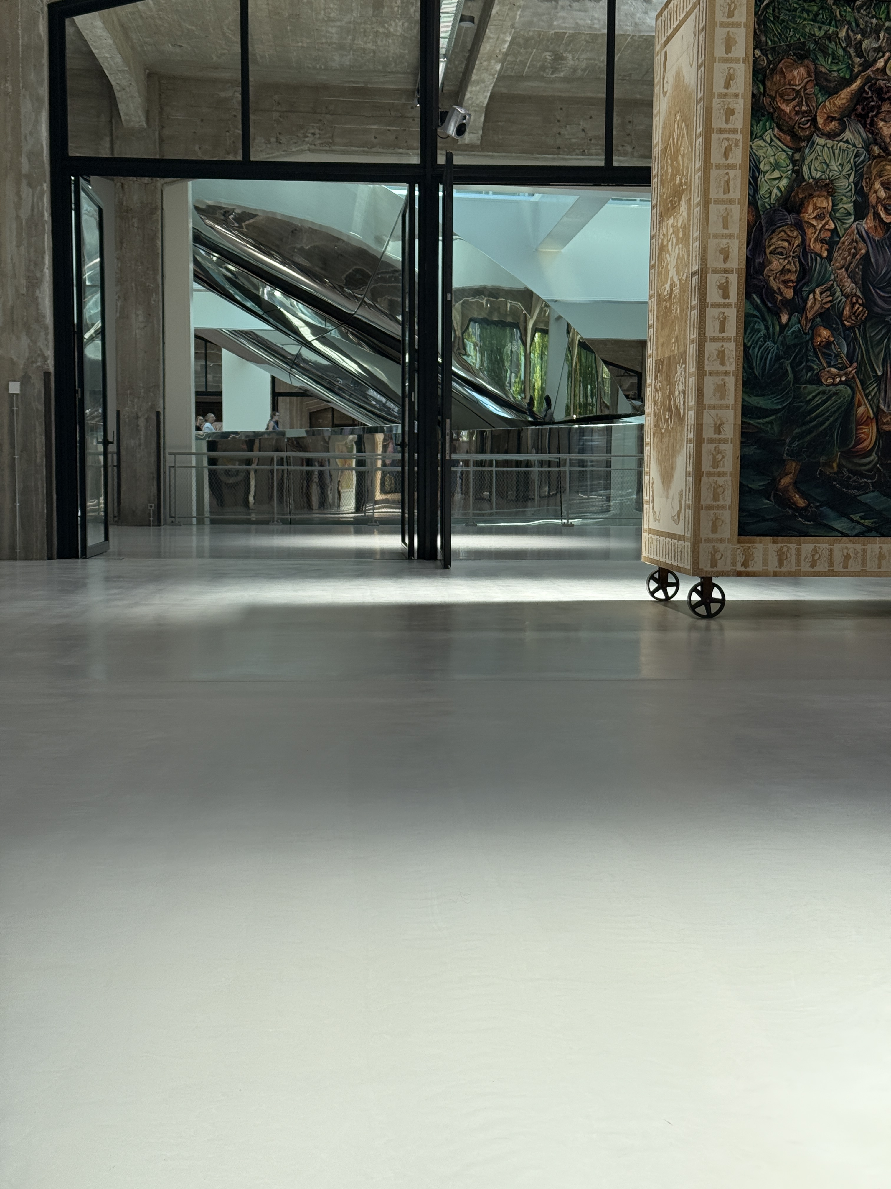 The expanse of the exhibition spaces are long and provide undisrupted views allowing the natural light to flow through. The rough finish of the walls give texture and rawness- both complementary and in contrast to the works of art. The topics themselves new, contemplative and uncomfortable- the space gives the room to allow the art to speak.