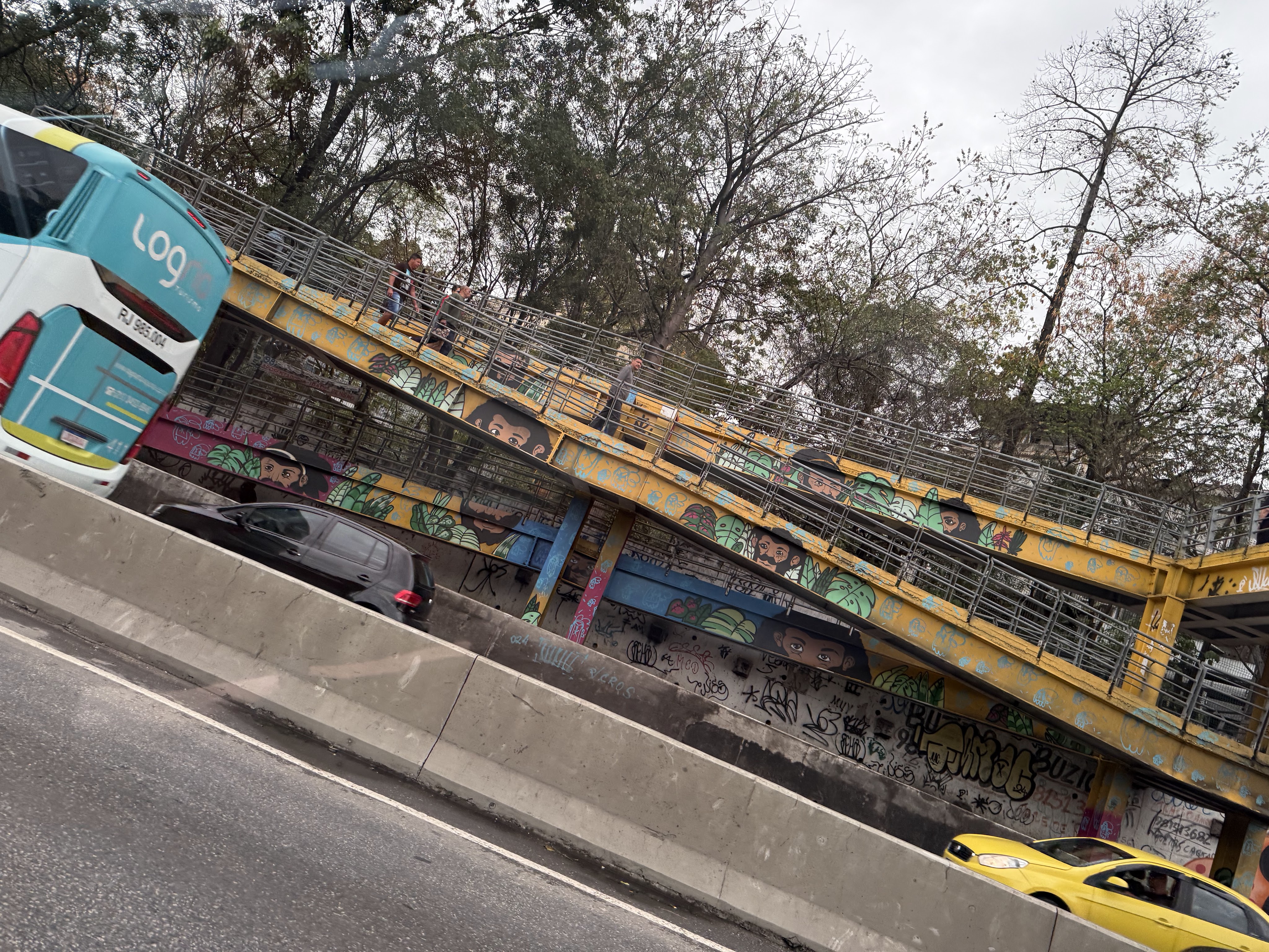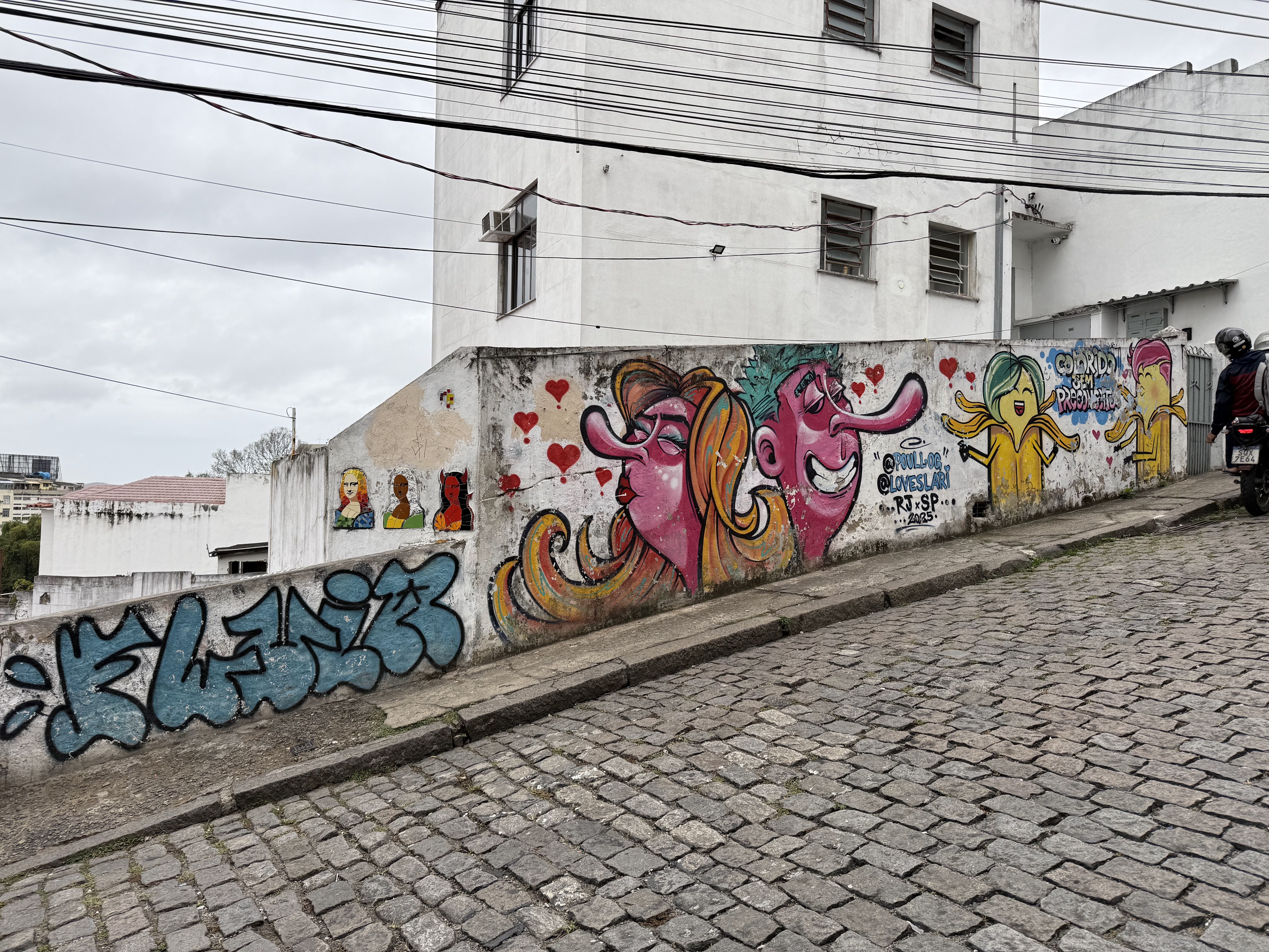 - Juliana Fervo: If you look closely to the right of the large portrait of the woman with teal glasses, you can see her signature stacked in yellow text (“JULIANA FERVO”). She is a well-known autodidact urban artist and muralist from Rio, easily recognized by her vibrant portraits and floral styles.