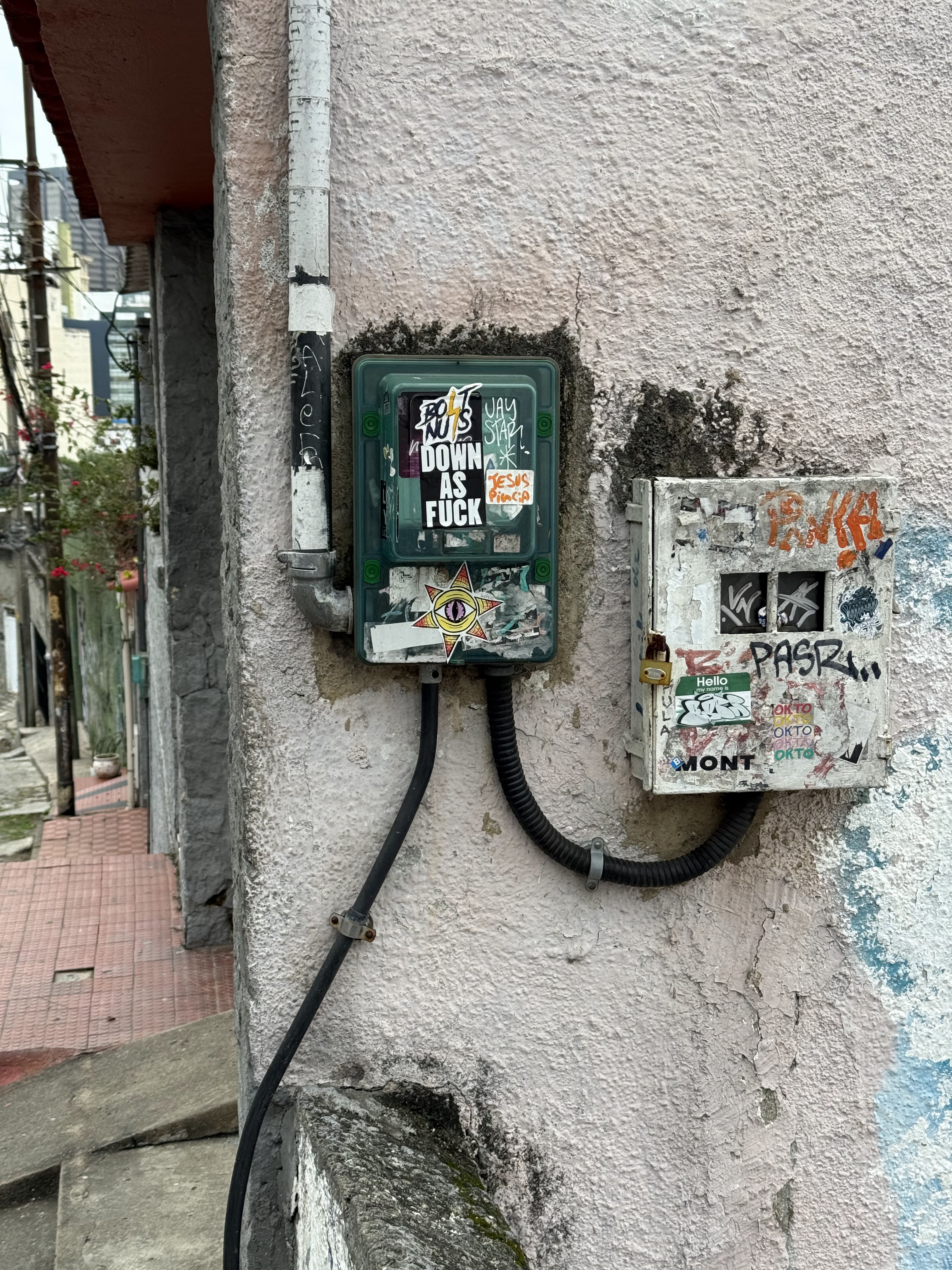 Based on the signatures and tags visible in the photo, we can definitely identify two prominent graffiti artists who contributed to this mural at the Beco das Carmelitas (also known as Beco do Pantera) in the Lapa neighborhood of Rio de Janeiro:
