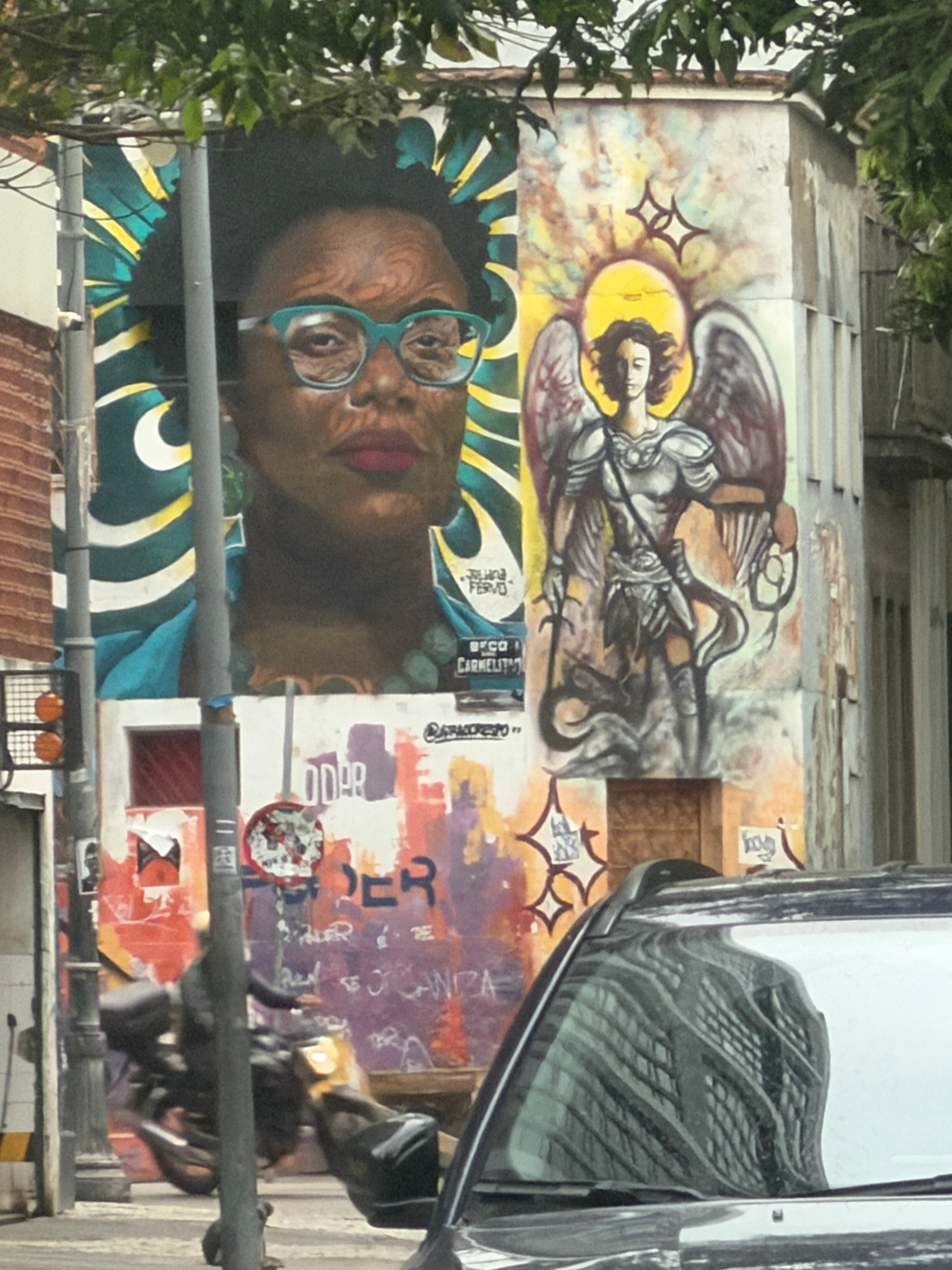 - Juliana Fervo: If you look closely to the right of the large portrait of the woman with teal glasses, you can see her signature stacked in yellow text (“JULIANA FERVO”). She is a well-known autodidact urban artist and muralist from Rio, easily recognized by her vibrant portraits and floral styles.