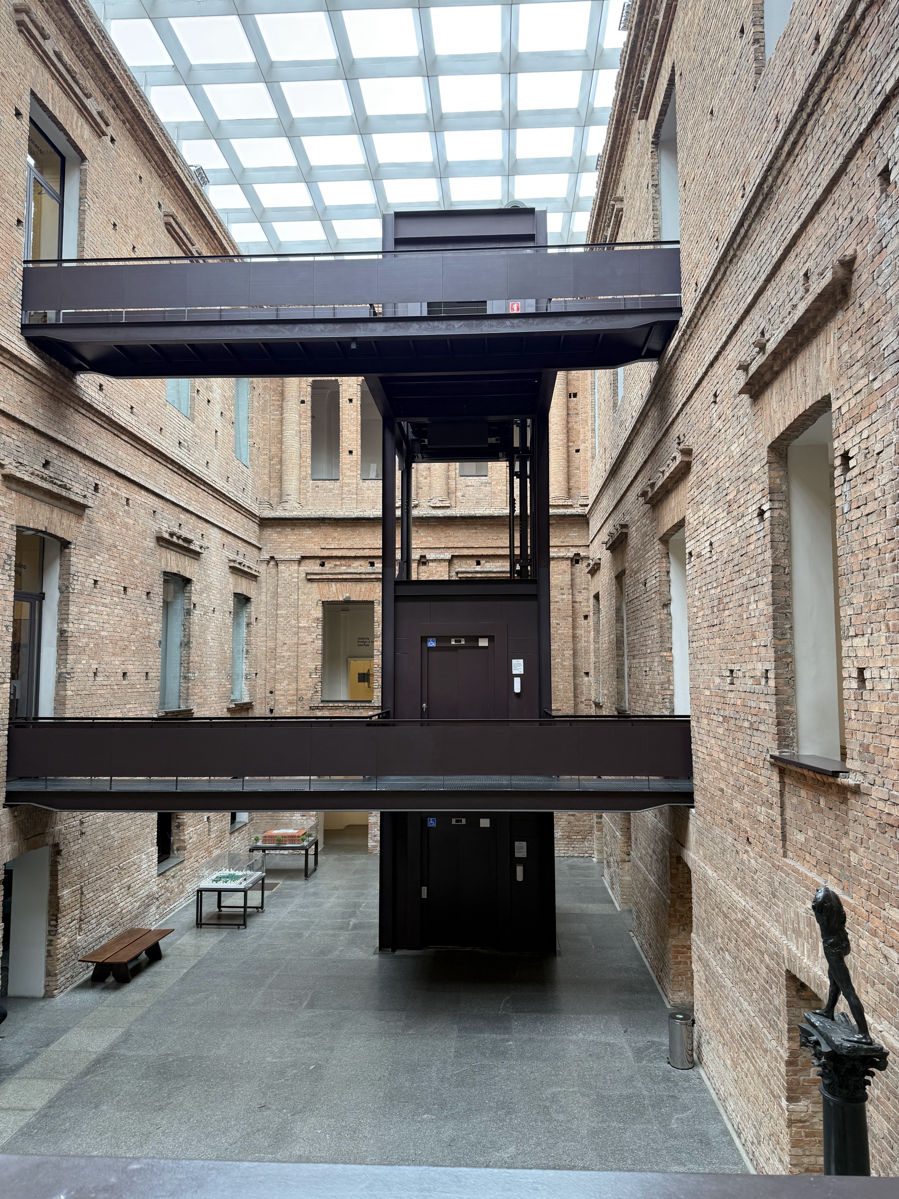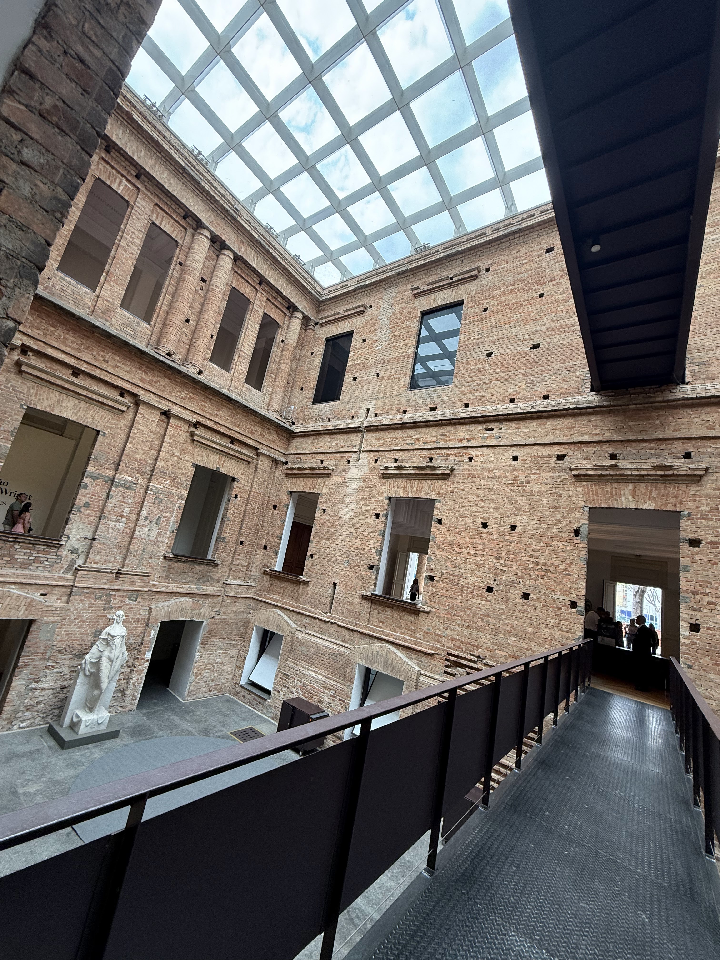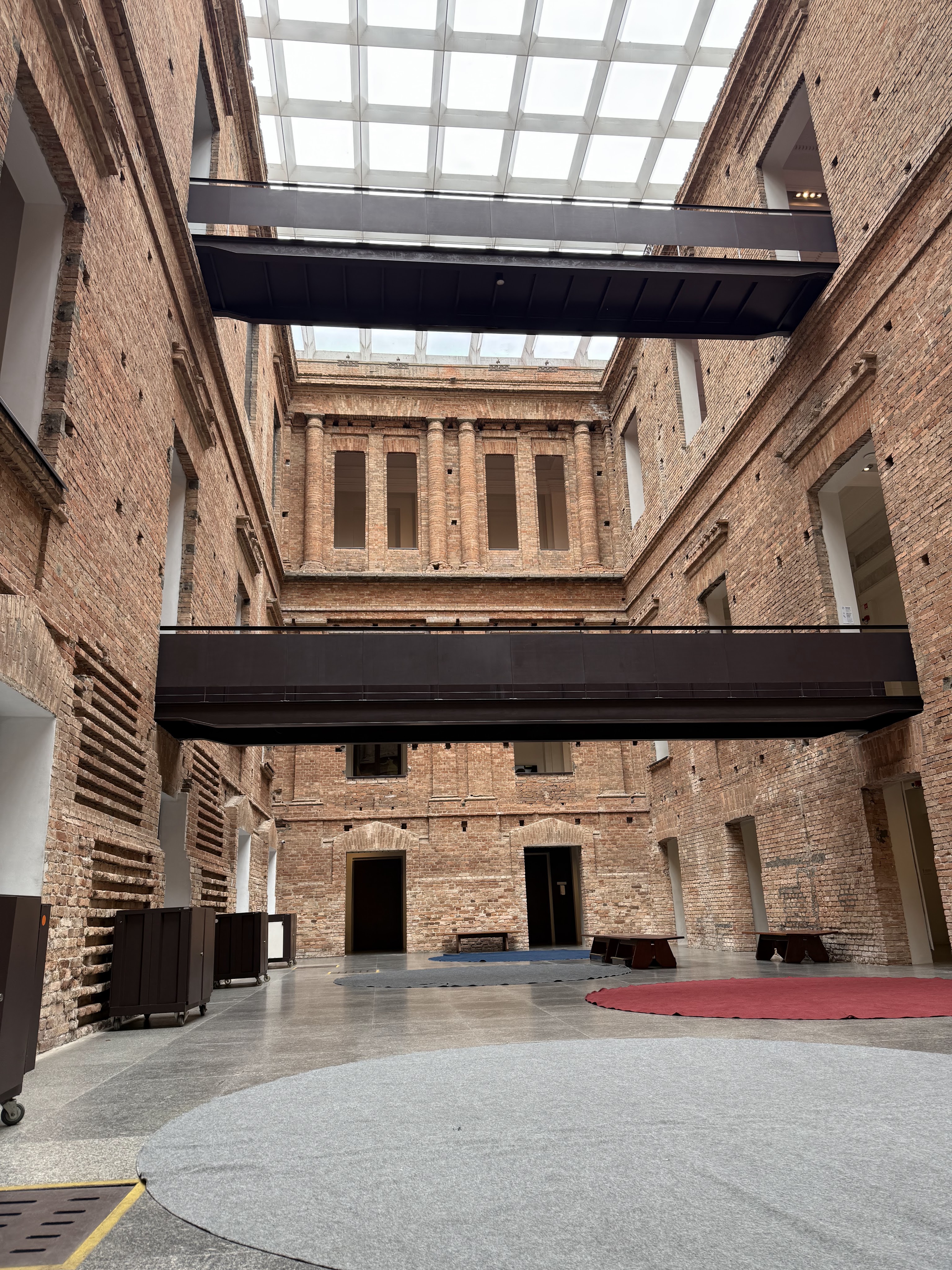 Mendes da Rocha gutted the interior, added metal walkways, and covered the internal courtyards with glass skylights, blending the old world with industrial modernity. He famously chose not to plaster the walls. He left the original red brick exposed, celebrating the “unfinished” nature of the building- often described as “industrial-chic” or “tectonic.”