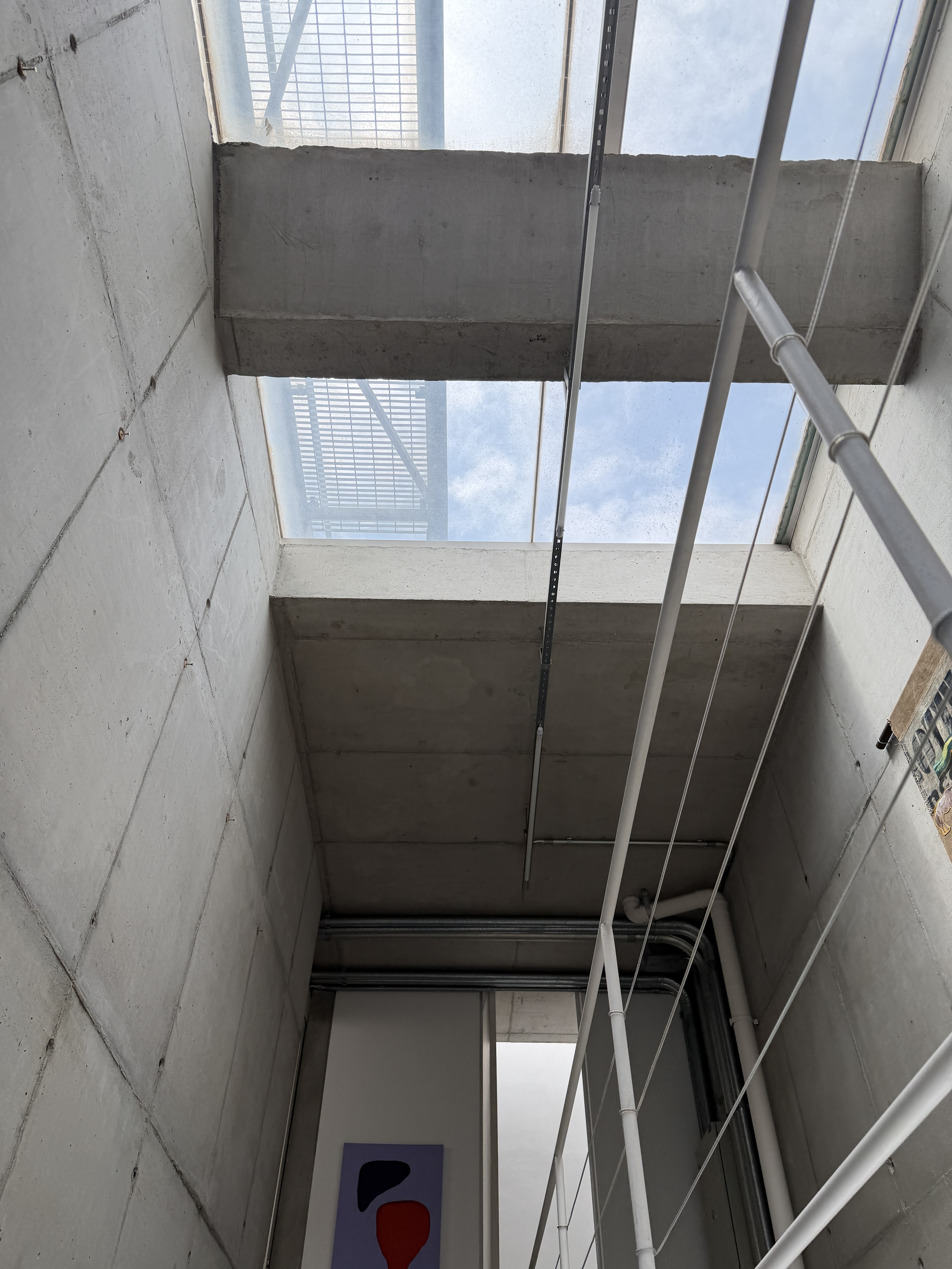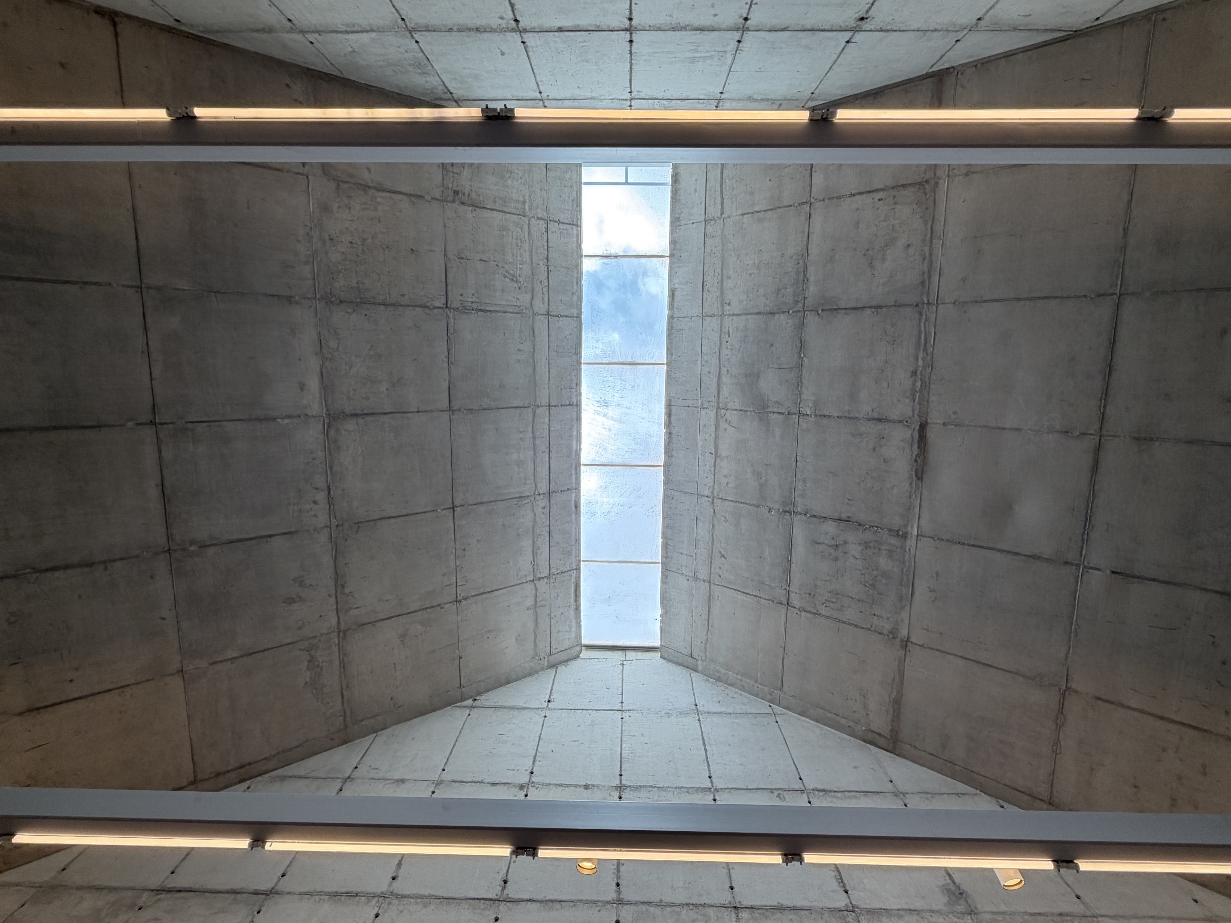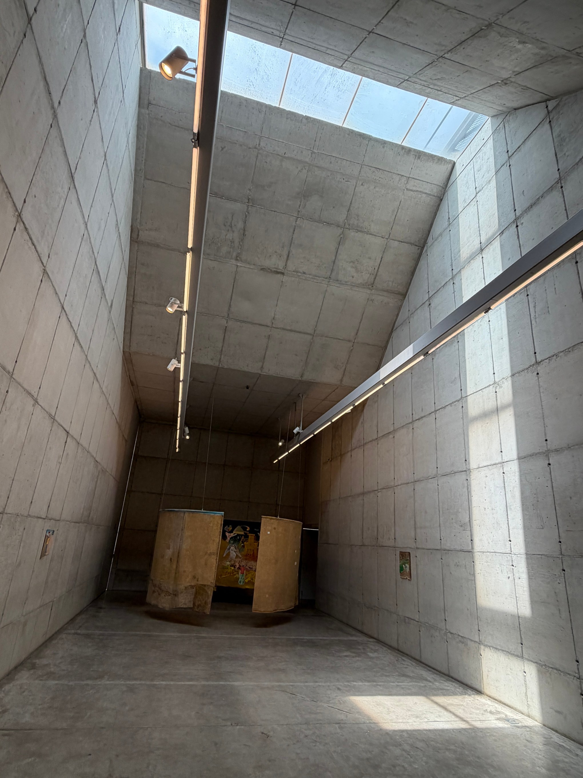 Similarly, the skylights in this building create an ambience of calm- a thoughtfulness to being in such an exposed place building material wise. A place where while there is no forgiveness in the hardness of the concrete that even then there is a way to work with and open up the material. The contrast brings consideration to the mind.